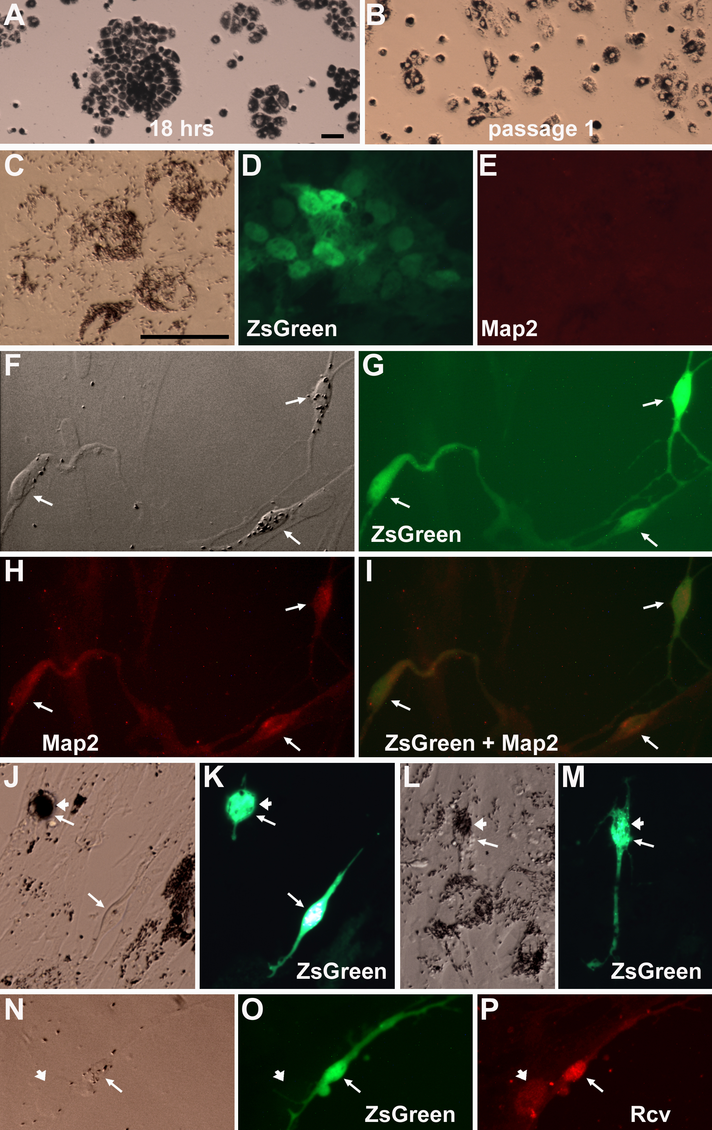 (F), epi-fluorescence for ZsGreen1 (G), immunostaining for Map2 (H), or a merged view (I). Arrows point to ZsGreen1+ cells with a neural morphology. J-M show neuron-like ZsGreen1+ cells (arrow) with aggregate of dark pigment granules (arrowhead) in cultures infected with Lvx-ngn3-IRES-ZsGreen1. N-P are porcine RPE culture infected with Lvx-ngn1-IRES-ZsGreen1 under with bright-field (N), epi-fluorescence for ZsGreen1 (O), immunostaining for recoverin (P). Arrow points to a ZsGreen1+/Recoverin+ cell; arrowhead points to a ZsGreen1¯/Recoverin¯ cell. The scale bars are 25 µm and the one in C applies to all except A, B.