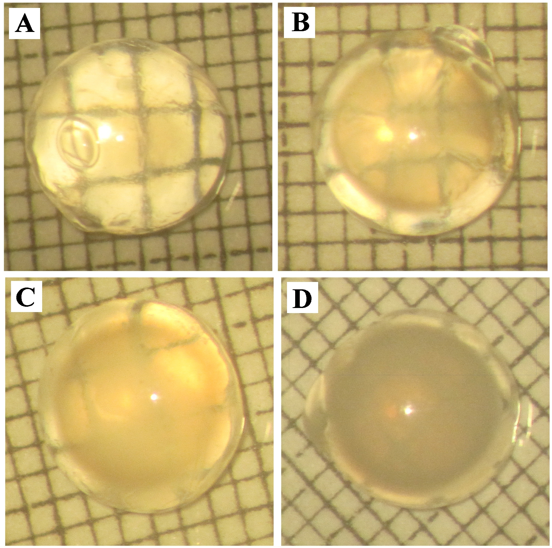 to a specific grade in the range of 0 to 3. Each picture (A-D) is representative of each grade. A: Grade 0: absence of opacification (gridlines clearly visible); B: Grade 1: a slight degree of opacification, with minimal clouding of gridlines; C: Grade 2: diffuse opacification involving almost the entire lens, with gridlines faintly visible; D: Grade 3: extensive dense opacification involving the entire lens (gridlines not visible).