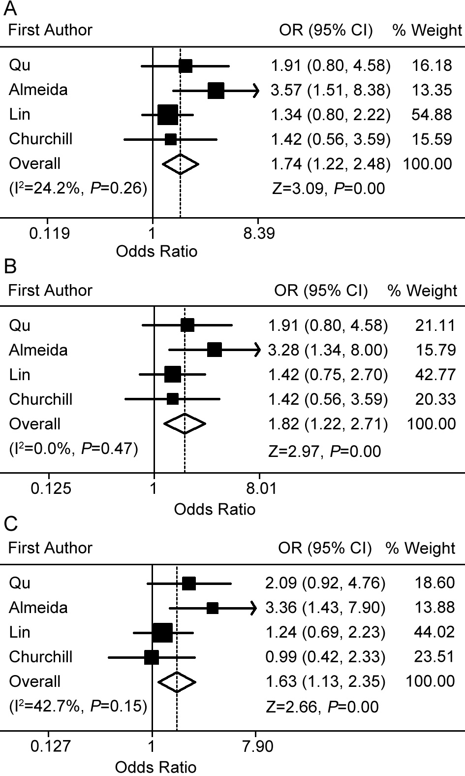 A: Results from fixed effects meta-analysis of TT versus CT model in the overall comparison.