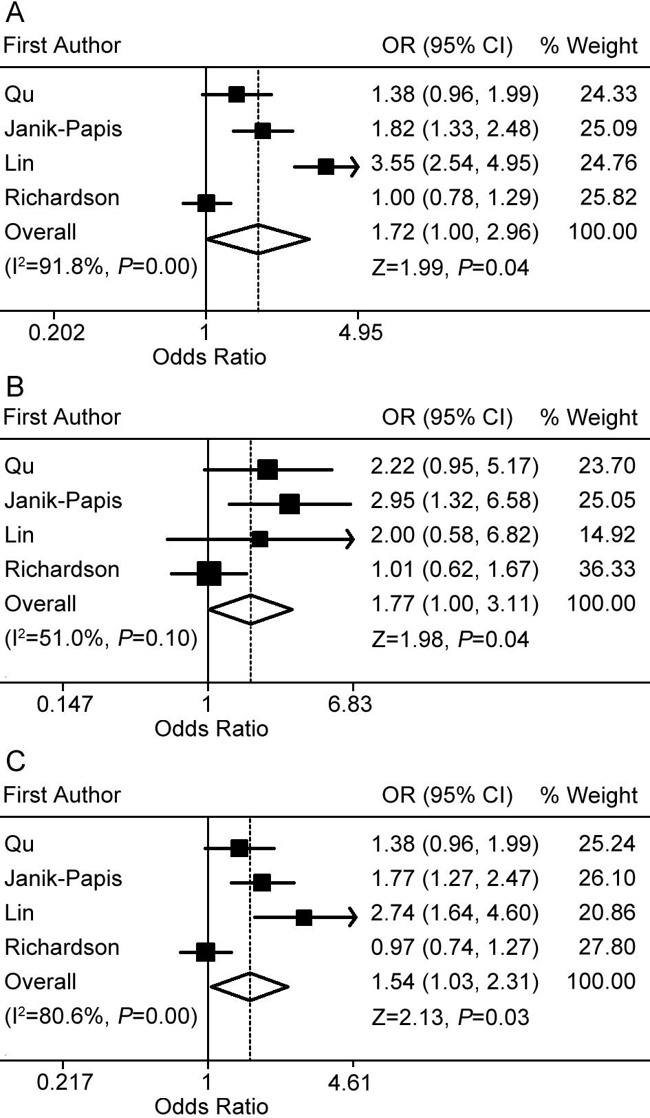 A: Results from random effects meta-analysis of C allele versus T allele in the overall comparison.