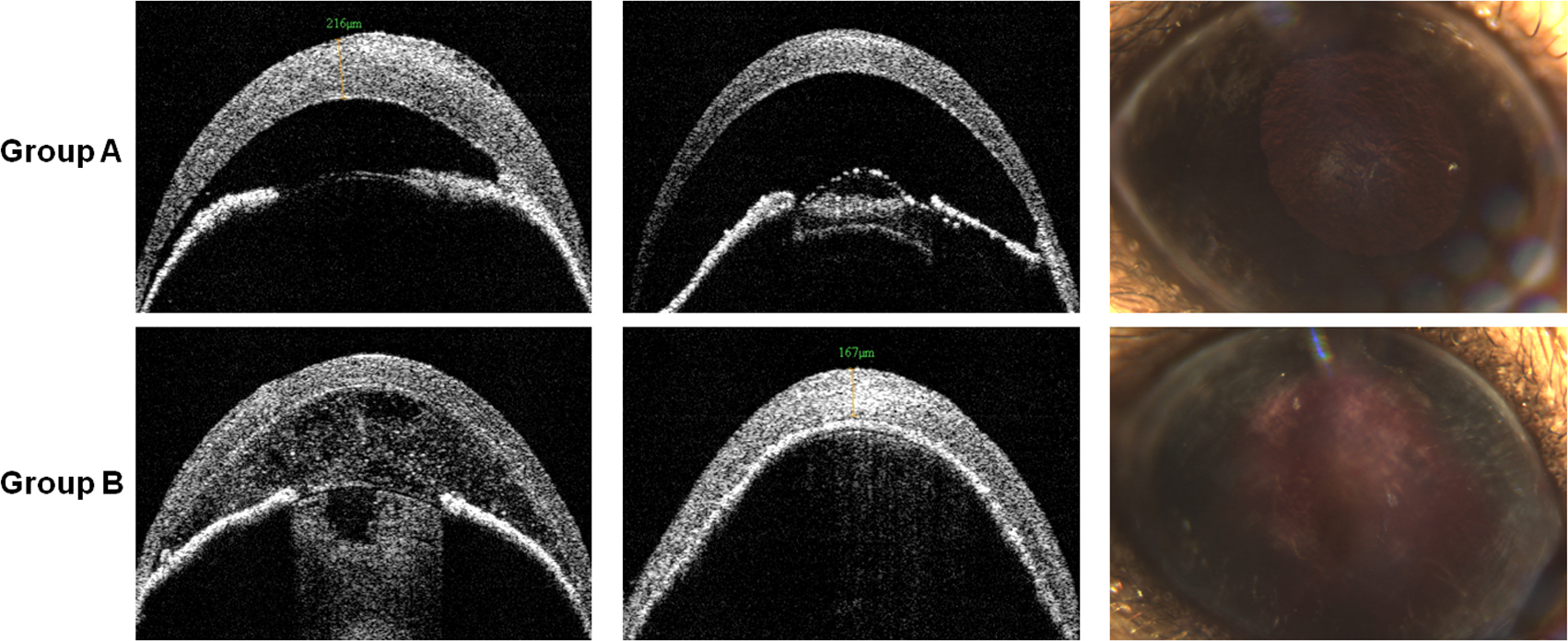 and mild cataract (middle and right) were found. In group B, serious complications including severe anterior chamber inflammation