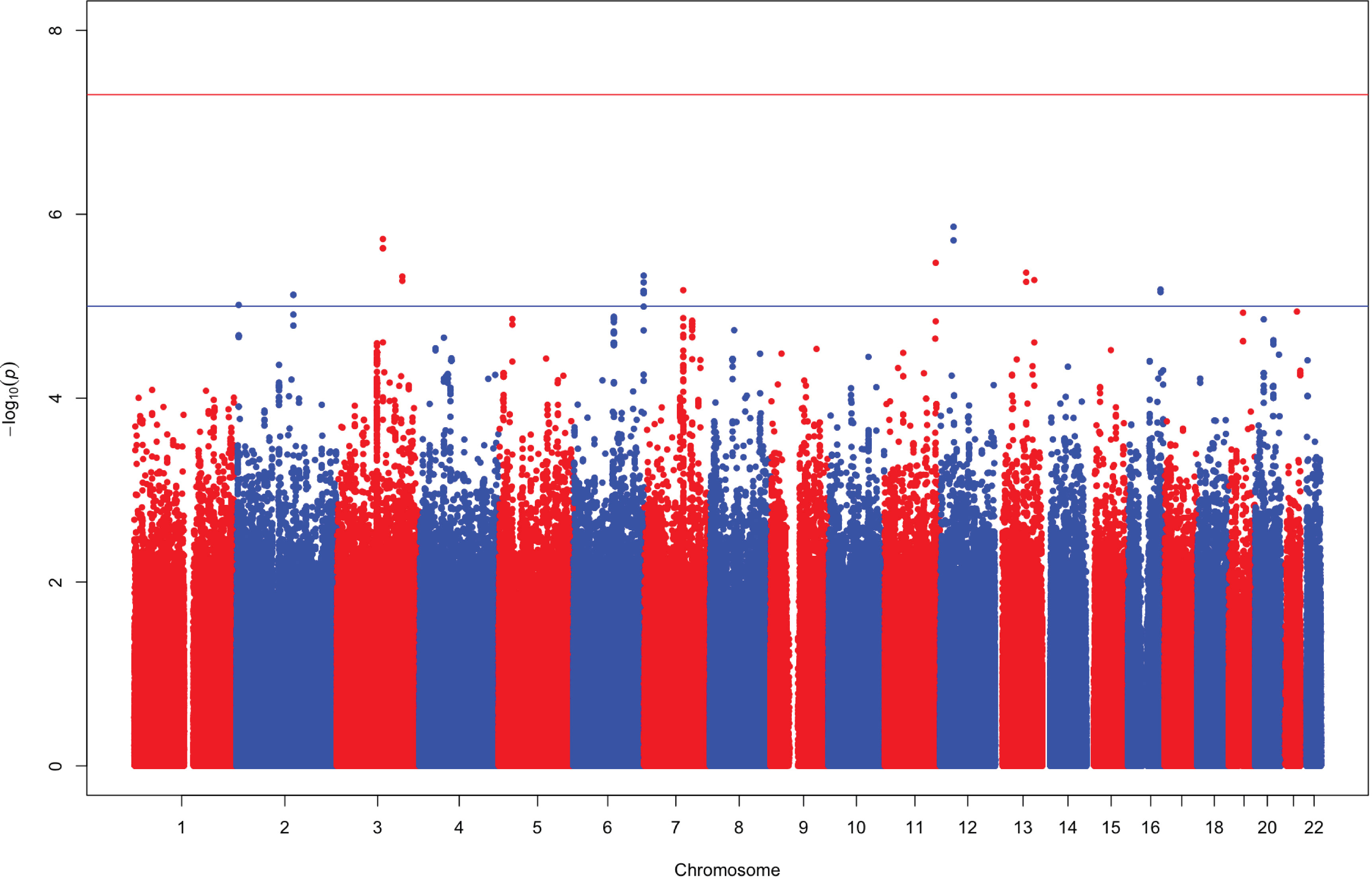 Manhattan plot of meta-analysis results. The association of single nucleotide polymorphisms and corneal astigmatism (age and sex adjusted) are plotted for each chromosome.