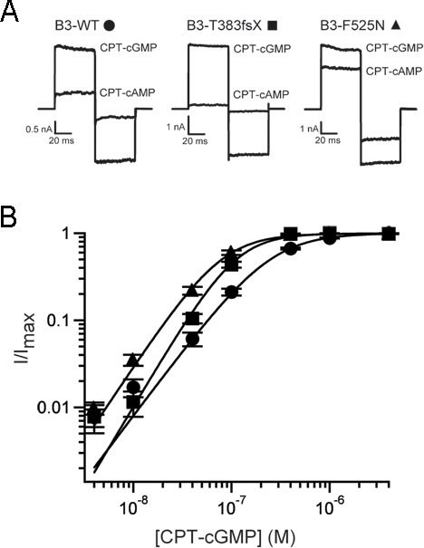 (circles), T383fsX (squares), or F525N (triangles) subunits. Currents were normalized to the maximum cGMP current. Continuous