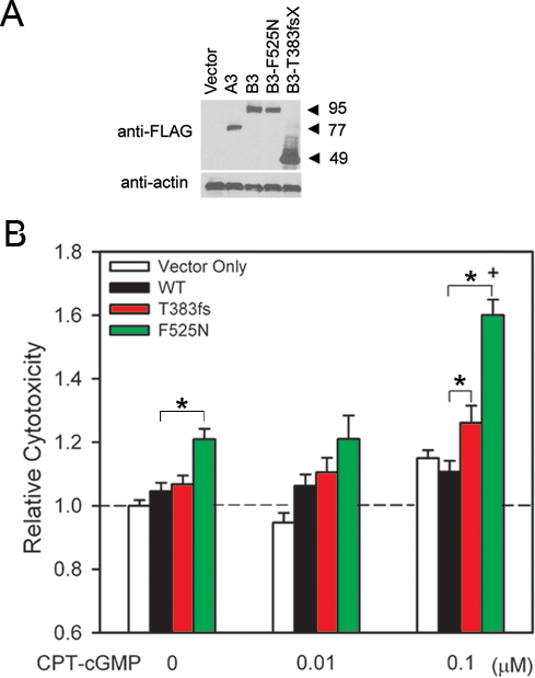 actin was ~42 kDa. B: The bar graph demonstrates increased cytotoxicity (measured as LDH release from dying cells) for cells expressing CNGA3