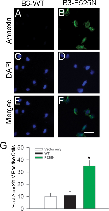 with a high affinity for phosphatidylserine (A and B). Cells were also counterstained with DAPI to count nuclei (C and D), and the two images were merged to count annexin V–positive cells (E and F). G: Summary bar graph for annexin V staining of cells transfected with control plasmid, wild-type CNGB3 plus CNGA3, or CNGB3-F525N