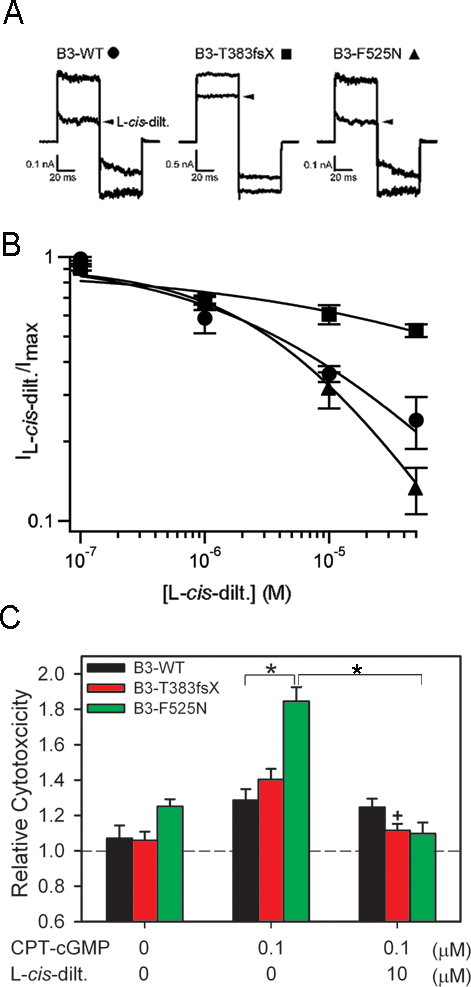Figure 6. Block of CNG channels by L-cis-diltiazem increases viability of cells expressing CNGB3 with disease-associated mutations. A: Representative current traces elicited by 0.1 µM CPT-cGMP in the absence or presence (arrow) of 10 µM L-cis-diltiazem. Current traces were elicited by the voltage protocol described in the Methods section. B: Dose–response relationships for block by L-cis-diltiazem in the presence of 0.1 µM CPT-cGMP for heteromeric CNG channels containing CNGB3-WT (circles), T383fsX (squares),