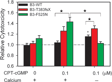 Figure 7. Removal of extracellular Ca2+ from culture media prevented the increase in cytotoxicity for cells expressing CNGB3 F525N. Bar graph of the relative cytotoxicity