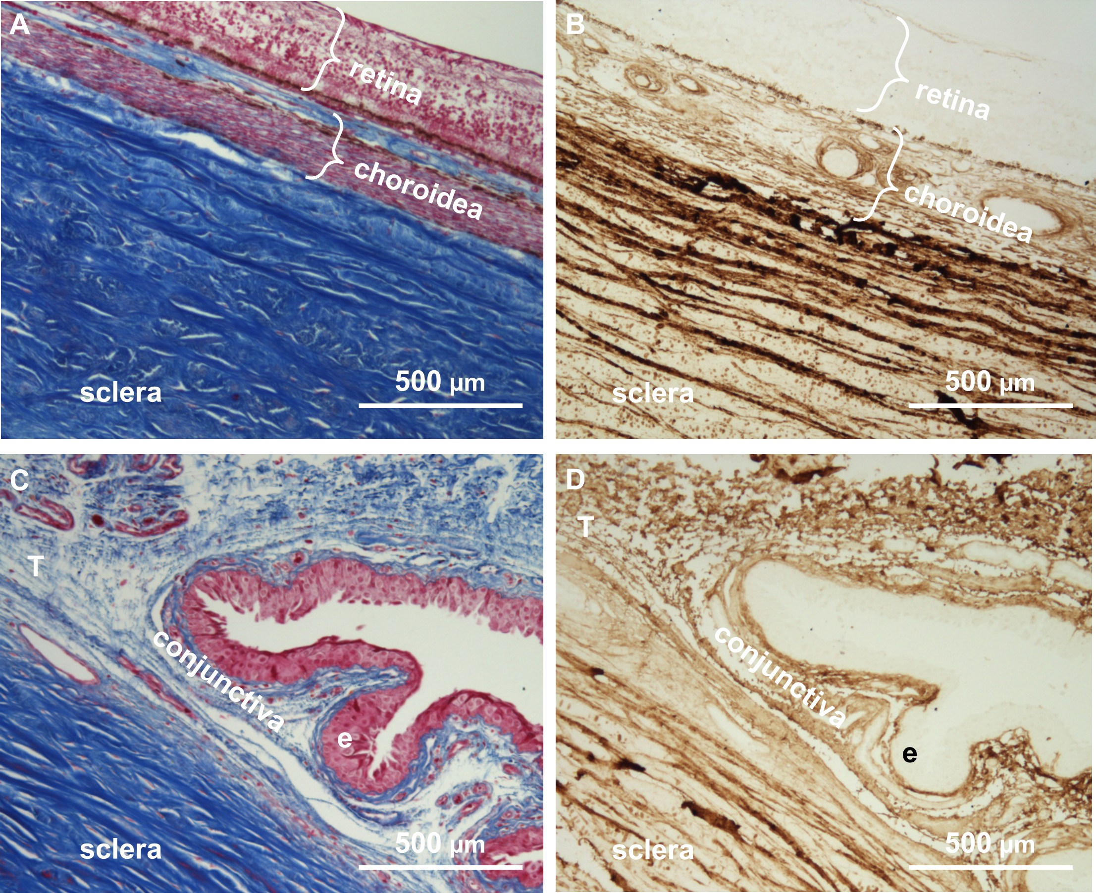 Figure 3. Histology and immunohistochemistry. A: The Cross section of the eyeball was stained for connective tissue. B: The Cross section of the eyeball was stained for collagen I. C: The cross section through the conjuntival fornix was stained for connective tissue. D: The cross section through the conjunctival fornix was stained for collagen I. Collagen I is absent from the retina and the