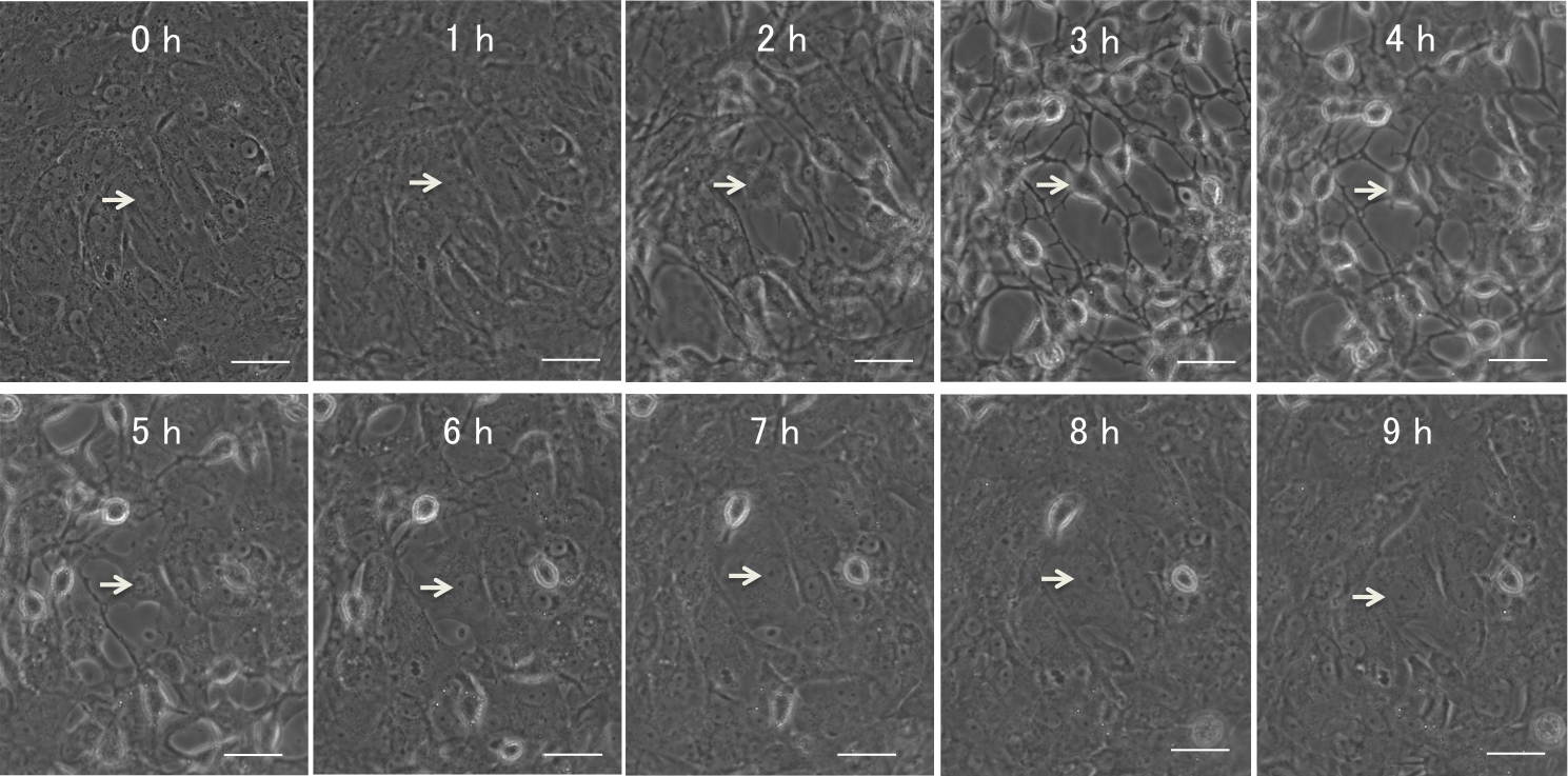 Figure 3. Time-lapse images of porcine trabecular meshwork (PTM) cells treated with 600 μM H2O2. Time-lapse sequence of PTM cells after treatment with 600 μM H2O2 were recorded every 15 min. The figure with “0 hour” (left upper) shows PTM cells immediately after H2O2 treatment. Arrow indicates an affected cell in the sequence. Scale bar represents 50 μm.