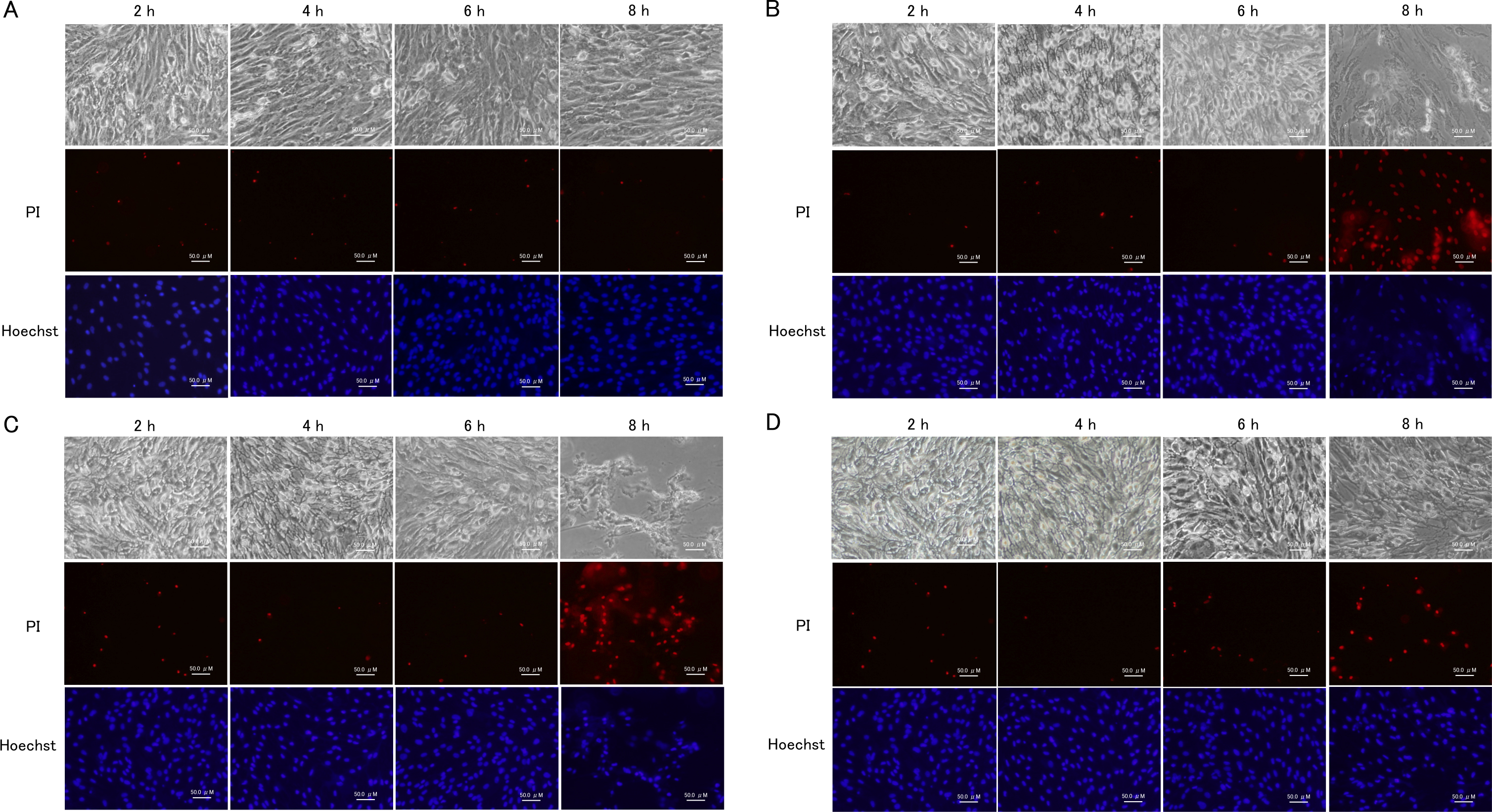 were pretreated with vehicle (A), LY294002 (10 μM; B), U0126 (10 μM; C), SB203580 (10 μM; D), inhibitors of PI3K, ERK1/2, or p38, respectively, for 1 h, and then treated with medium alone (A) or 600 μM H2O2 (B–D) for various amounts of time. The cells were stained with propidium iodide to detect cell death, (red; middle panel). Nuclei