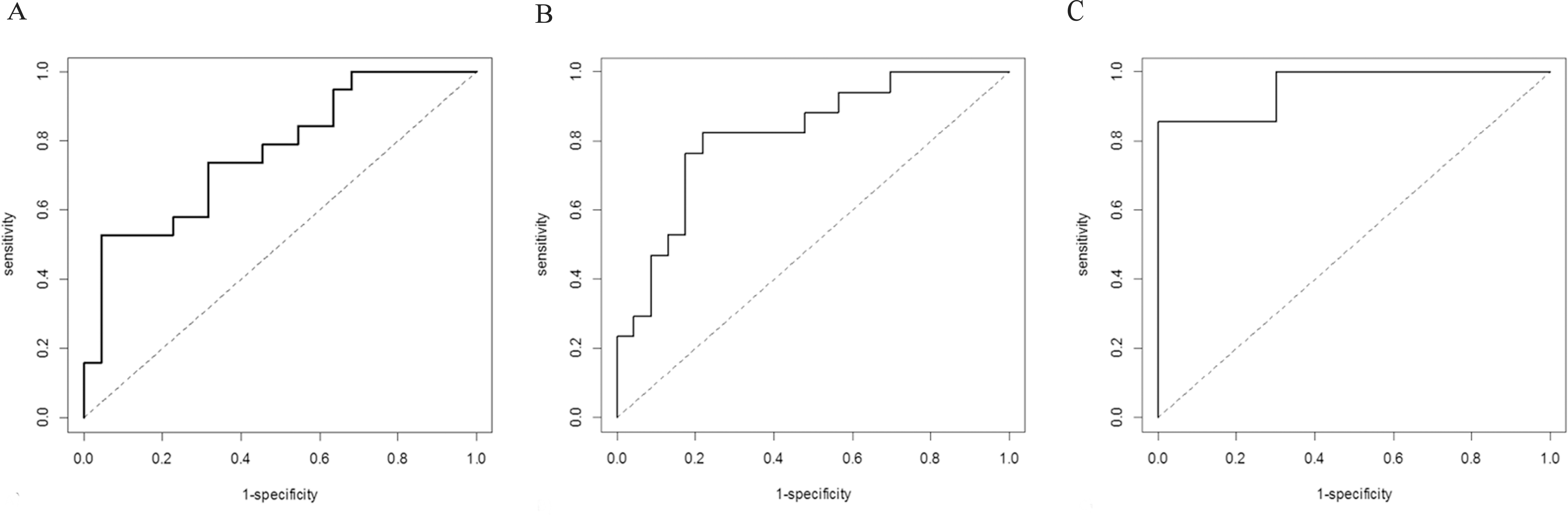 Figure 2. The receiver operating characteristic (ROC) curves for superoxide dismutase 2 (SOD2; A), aldehyde dehydrogenase 1 (ALDH1A1; B), and microsomal glutathione S-transferase 1 (MGST1; C) mRNA levels display molecular markers of pseudoexfoliation syndrome (PEX).