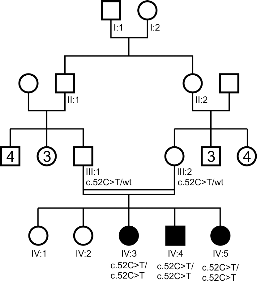 ) mutation c.52C>T p.R18X, while the parents (who are first-degree cousins) are heterozygous carriers.