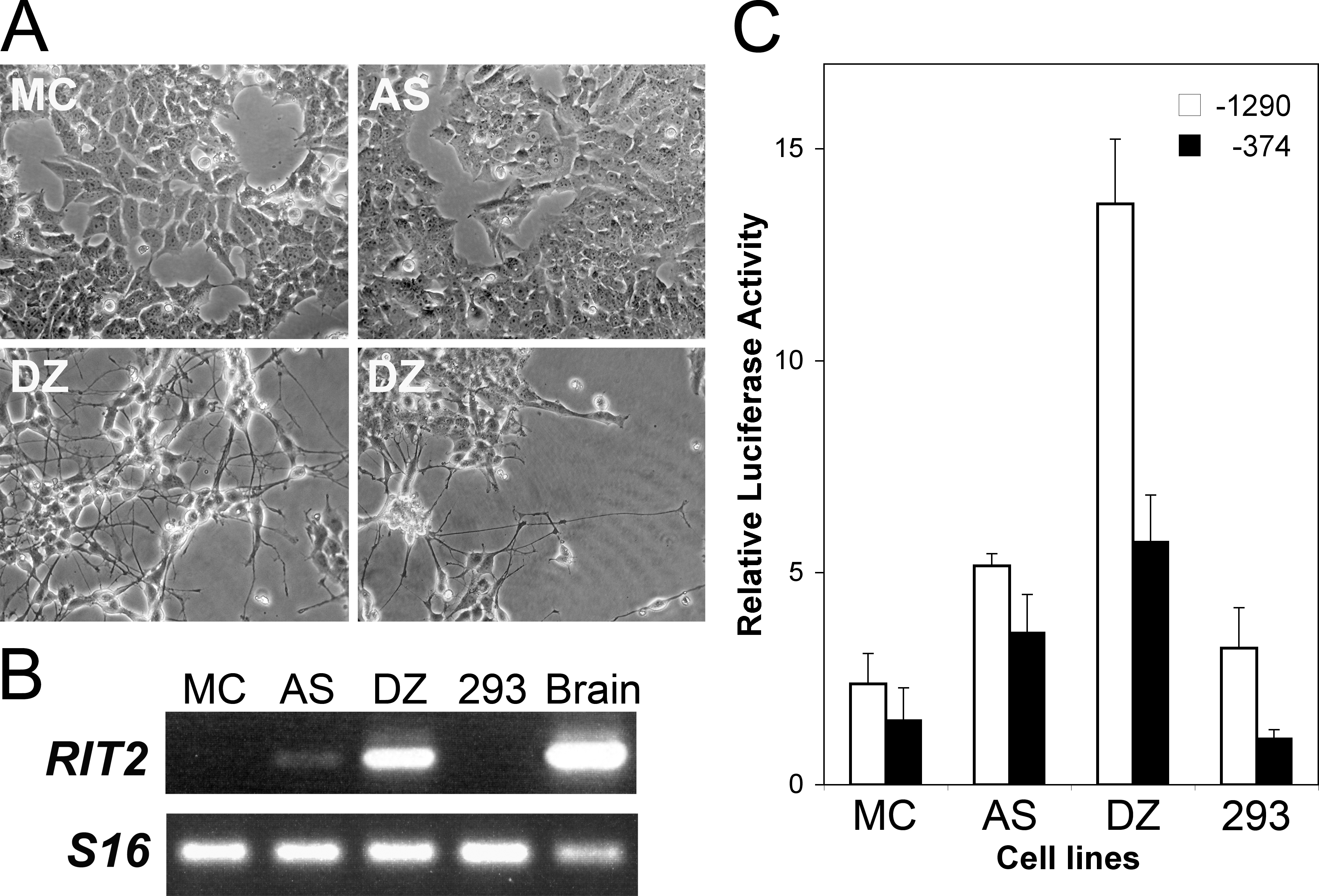 an inverted microscope. Cell lines used are SK-N-MC (labeled as MC), SK-N-AS (AS), and SK-N-DZ (DZ). B: This panel shows endogenous RIT2 expression. Total RNA was extracted from subconfluent cell cultures and analyzed by reverse transcription-polymerase chain