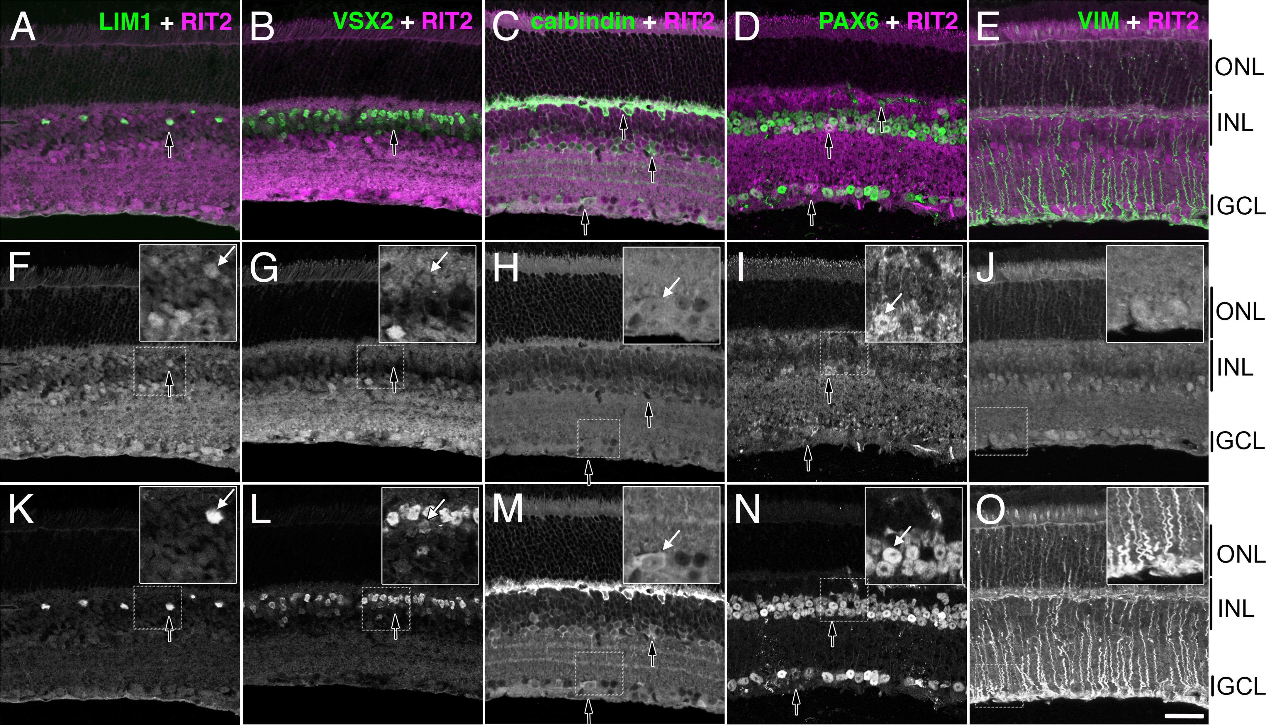 labeling of RIT2 with the horizontal cell marker LIM1 (A, F, K), the bipolar marker VSX2 (B, G, L), markers for a mixed population of horizontal, amacrine, and ganglion cells calbindin D28 (C, H, M) and PAX6 (D, I, N). Non-neuronal Müller glia was detected with an antibody against vimentin (E, J, O). Color images in the top panels represent merged images of double labeling for RIT2 and one of the cell-type-specific markers