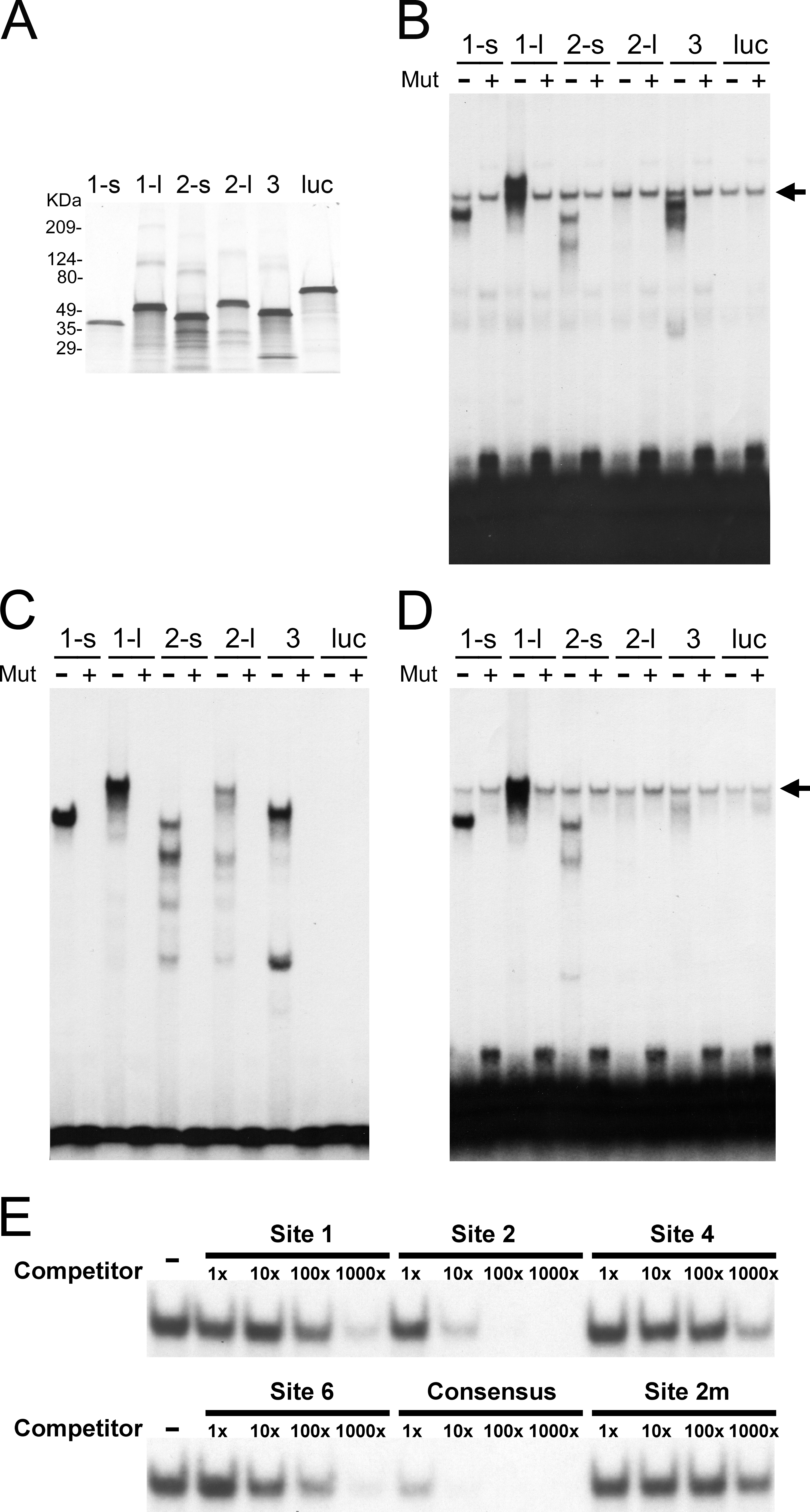 32P-labeled wild-type (labeled as Mut -) or mutated (Mut +) Probe 1 was incubated with 3 μl of each in vitro translated protein.
