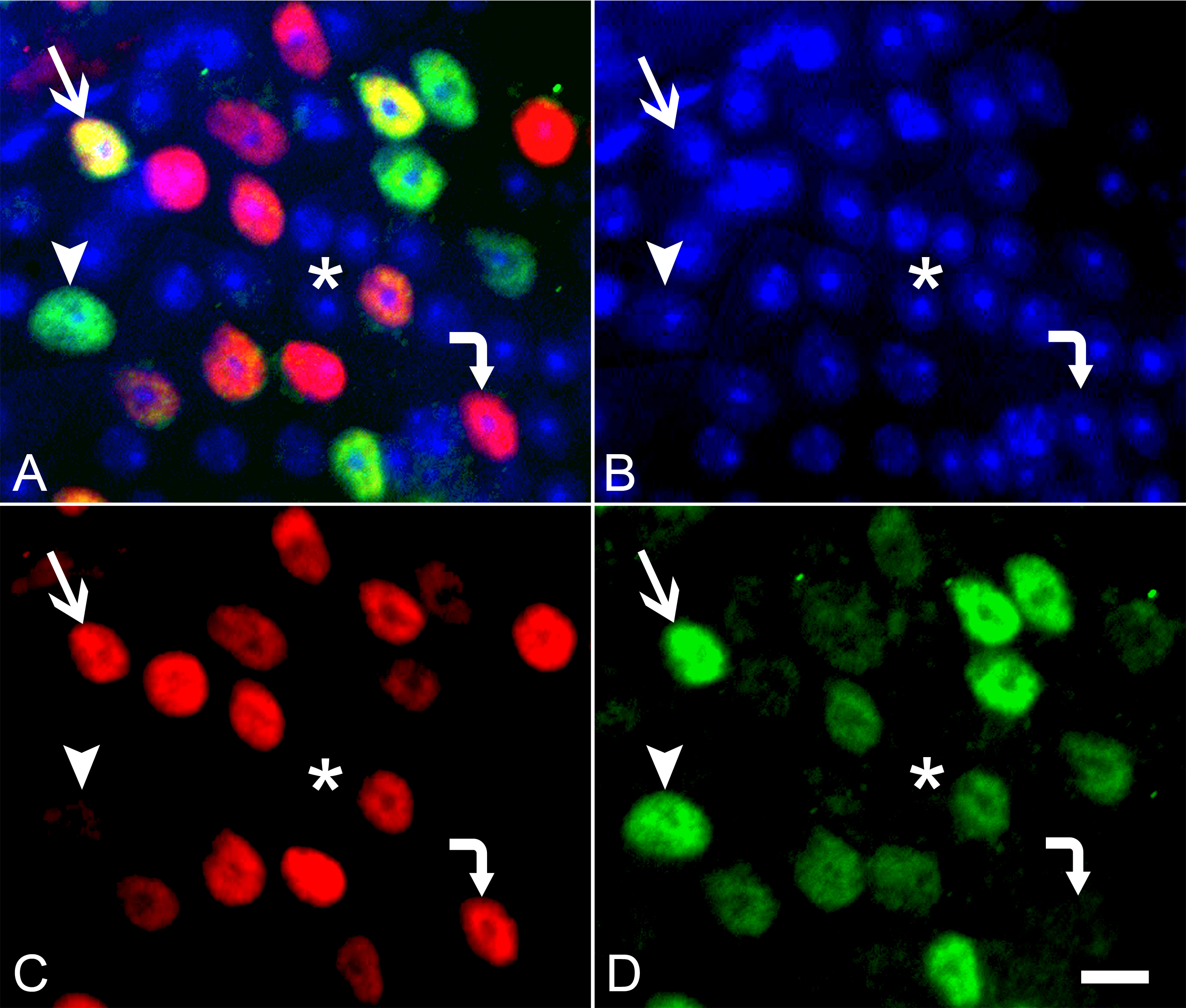 Figure 4. Immunofluorescent image of BRN3 positive ganglion cells. A: The merged image of BRN3A (red, panel C), BRN3B (green, panel D) and counterstained with 4',6-diamidino-2-phenylindole (DAPI, blue, panel B) is shown. This double labeling reveals four distinct classes of cell types. A cluster of cells that do not label with either