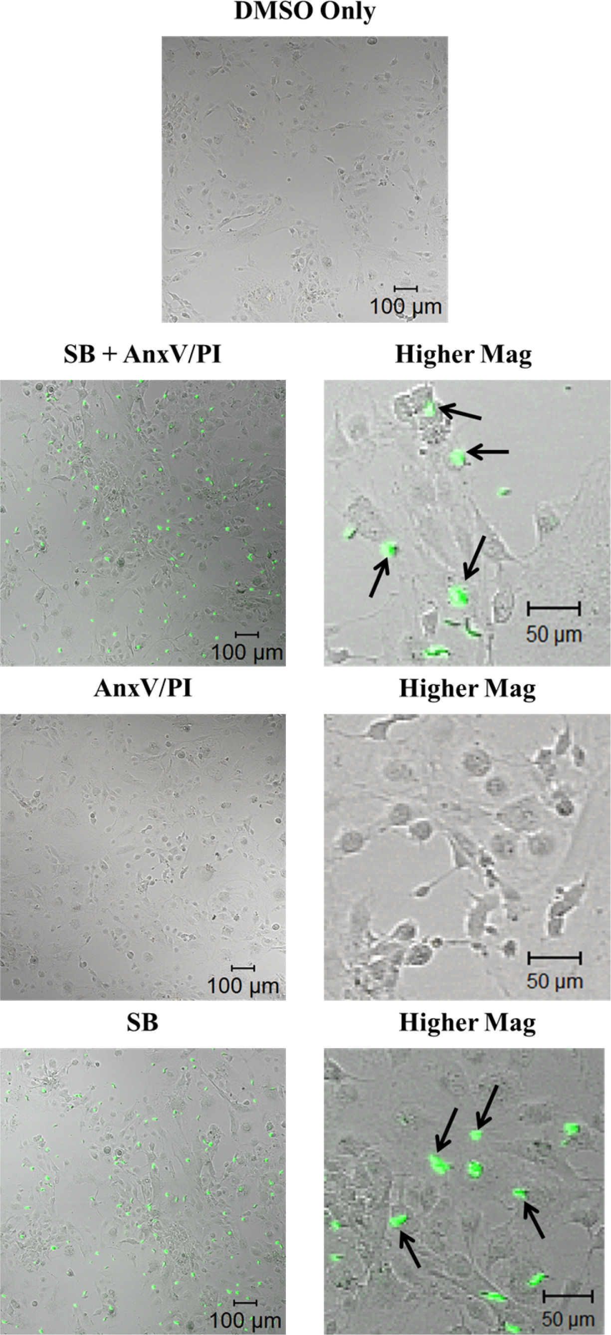 SB216763 treated cells additionally stained with annexin V-fluorescein isothicyanate/propidium iodide; (right panel) higher