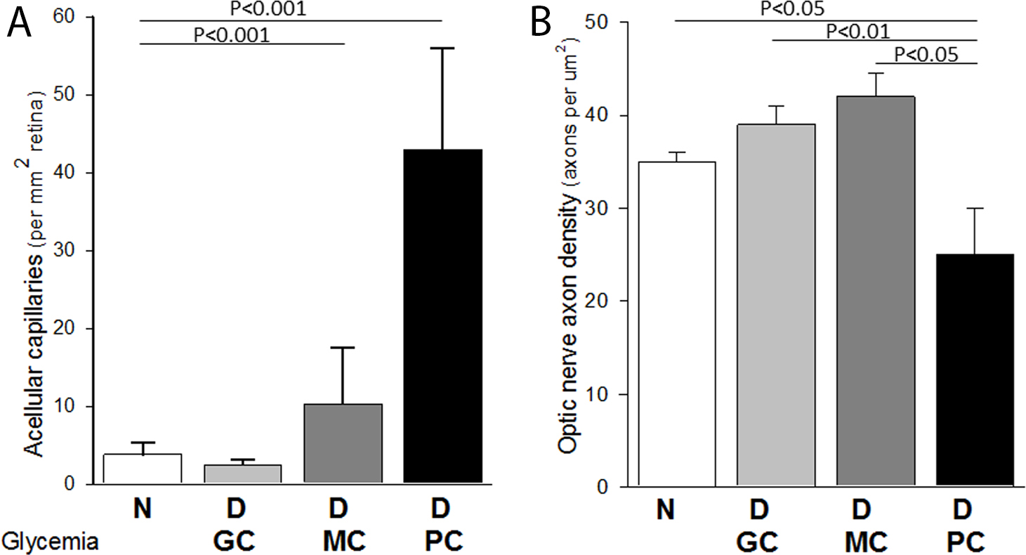 capillary degeneration increased progressively with glycemic control, whereas degeneration of retinal ganglion cell axons