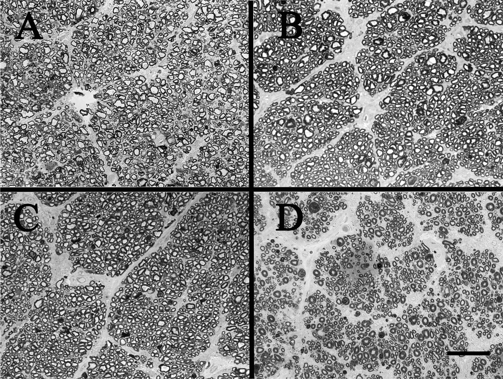 Figure 2. Effect of glycemic control on dog optic nerves as shown with optical microscopy. There is extensive axon loss only in the