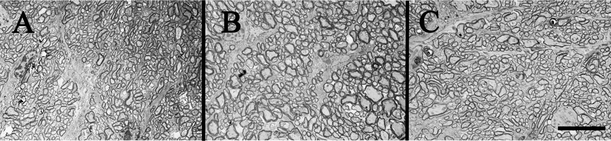 Figure 3. Diabetic and nondiabetic mouse optic nerves. A, B, and C show electron micrographs of diabetic and nondiabetic mouse optic nerves. No differences in axon density were observed between