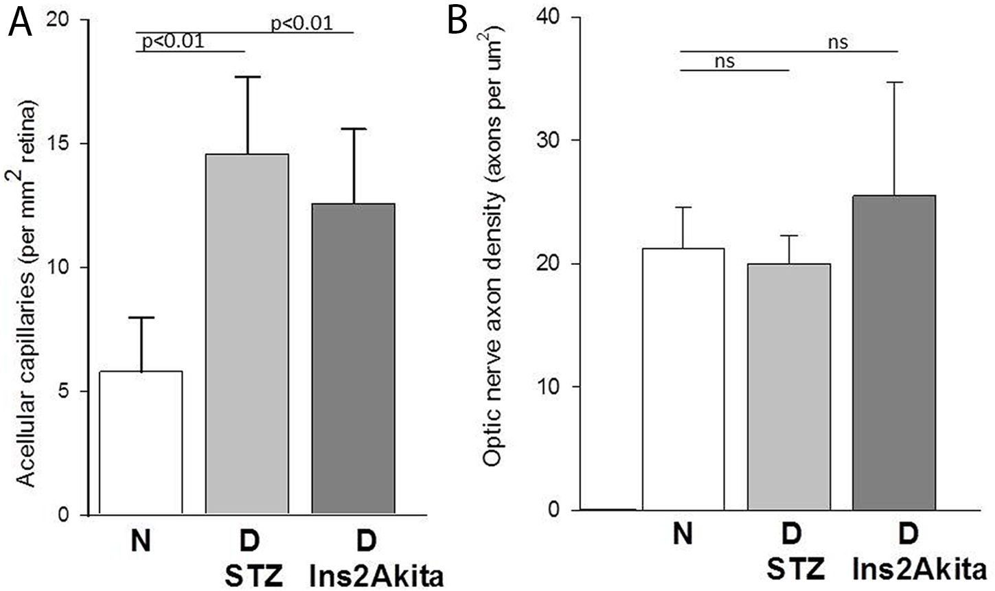 Figure 4. Comparison of the effects of severe diabetes on degeneration of retinal capillaries and retinal ganglion cells in diabetic