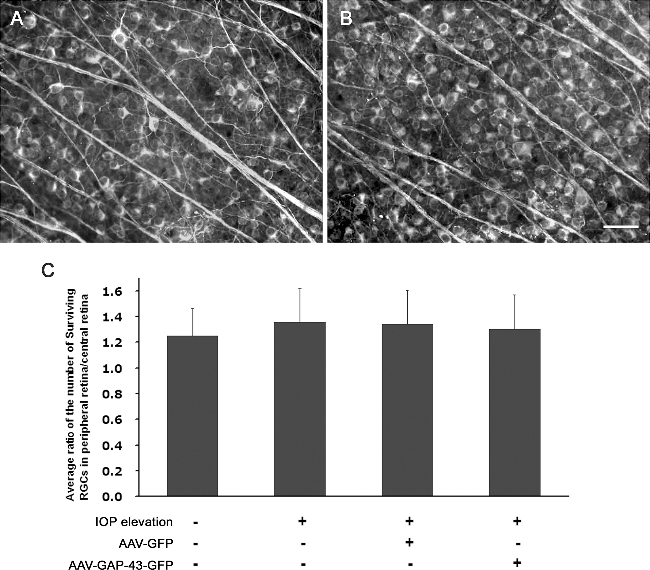 Figure 7. Comparison of central and peripheral retinal ganglion cells (RGCs) viability. Fluorescent photomicrographs of β-III tubulin+ surviving RGCs are shown on the central (A) and peripheral (B) retinas in intact retinas. C: Data from various experimental conditions are presented as the ratio of the number of survival RGCs in the peripheral region