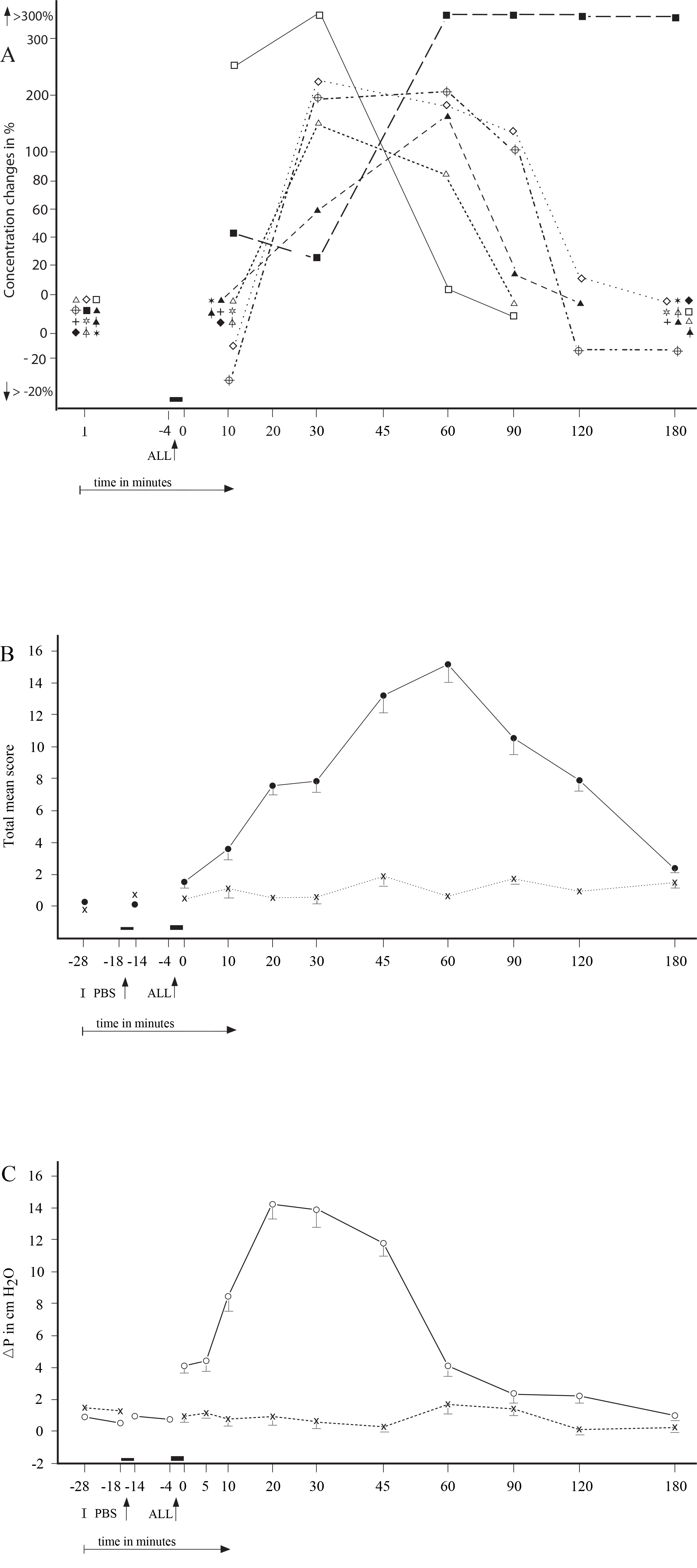 with phosphate-buffered saline (PBS, x); I = Initial (baseline) values; ALL= Nasal challenge with allergen.