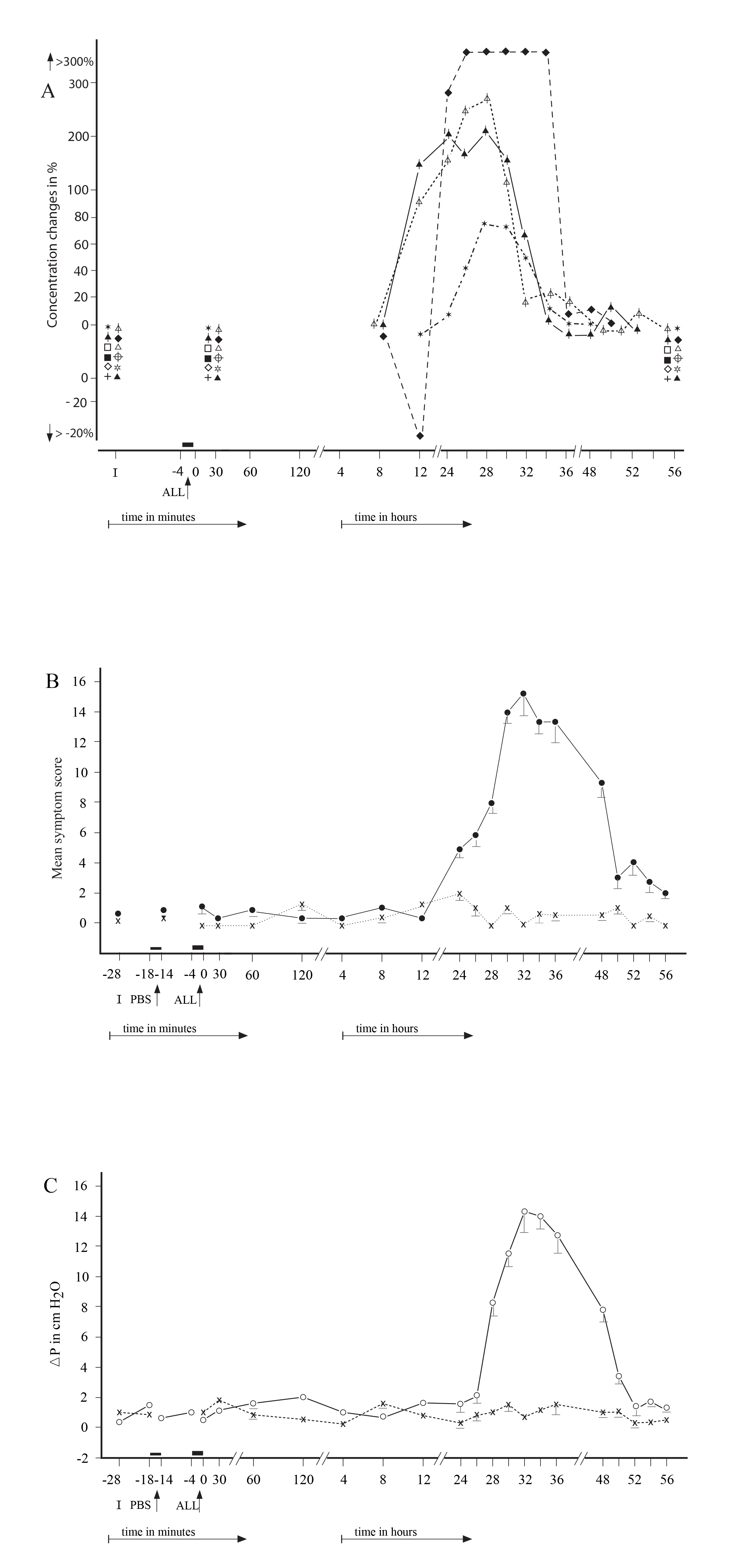 with phosphate-buffered saline (PBS, x). I = Initial (baseline) values; ALL = Nasal challenge with allergen.
