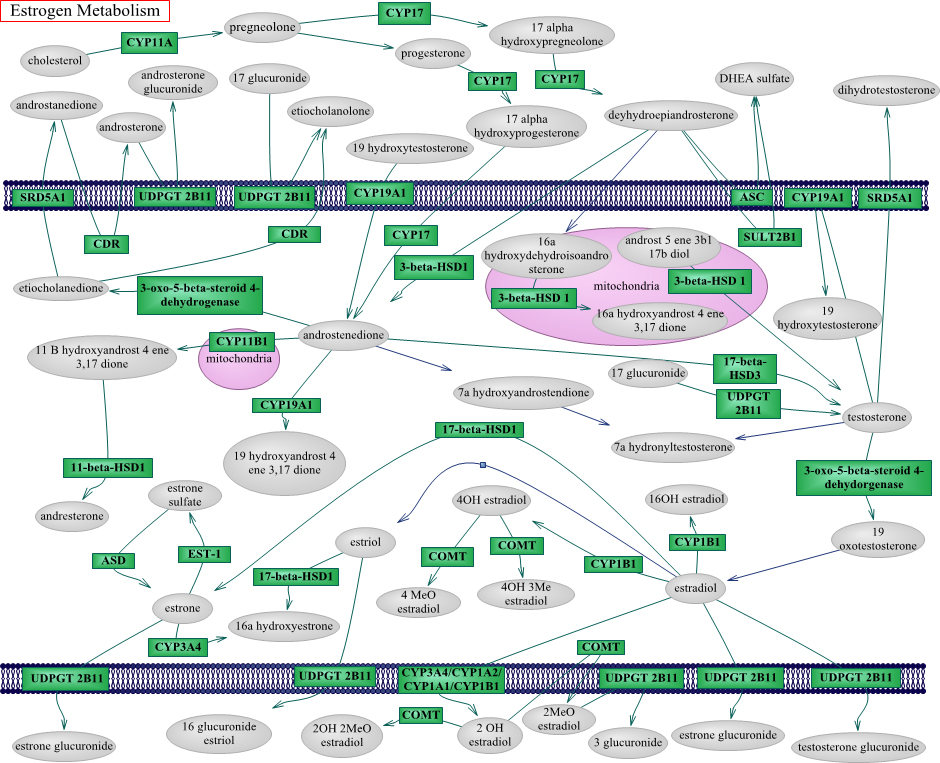 are as follows: CDR=Aldo-keto reductase family 1 member C4 (Chlordecone reductase), coded by AKR1C4; 3-oxo-5-beta-steroid 4-dehydrogenase=3-oxo-5-beta-steroid 4-dehydrogenase, coded by AKR1D1; ASD=Arylsulfatase D, coded by ARSD; COMT=catechol-O-methyltransferase, coded by COMT; CYP11A=cytochrome P450, family 11, subfamily A, polypeptide 1, coded by CYP11A1; CYP11B1=cytochrome P450, family 11, subfamily B, polypeptide 1, coded by CYP11B1; CYP17=cytochrome P450, family 17, subfamily A, polypeptide 1, coded by CYP17A1; CYP19A1=Cytochrome P450 19A1, coded by CYP19A1; CYP1A1=cytochrome P450, family 1, subfamily A, polypeptide 1, coded by CYP1A1; CYP1A2=cytochrome P450, family 1, subfamily A, polypeptide 2, coded by CYP1A2; CYP1B1=Cytochrome P450 1B1, coded by CYP1B1; CYP3A4=cytochrome P450, family 3, subfamily A, polypeptide 4, coded by CYP3A4; 11-beta-HSD1=Corticosteroid 11-beta-dehydrogenase isozyme 1 (11-beta-hydroxysteroid dehydrogenase 1), coded by HSD11B1; 17-beta-HSD1=Estradiol 17-beta-dehydrogenase 1 (17-beta-hydroxysteroid dehydrogenase type 1), coded by HSD17B1; 17-beta-HSD3=hydroxysteroid (17-beta) dehydrogenase 3, coded by HSD17B3; 3-beta-HSD1=3 beta-hydroxysteroid dehydrogenase/Delta 5-->4-isomerase type 1, coded by HSD3B1; SRD5A1=steroid-5-alpha-reductase, alpha polypeptide 1 (3-oxo-5 alpha-steroid delta 4-dehydrogenase alpha 1), coded by SRD5A1; ASC=Steryl-sulfatase (Arylsulfatase C), coded by STS; EST-1=Estrogen sulfotransferase, coded by SULT1E1; SULT2B1=Sulfotransferase family cytosolic 2B member 1, coded by SULT2B1; UDPGT 2B11=UDP-glucuronosyltransferase 2B11, coded by UGT2B11. Two genes not in the figure but in the pathway analysis are ESR1=estrogen receptor 1, coded by ESR1; ESR2=estrogen receptor 2 (ER beta), coded by ESR2. Single nucleotide polymorphisms for these genes are derived from the Illumina platform array. Additional abbreviations for