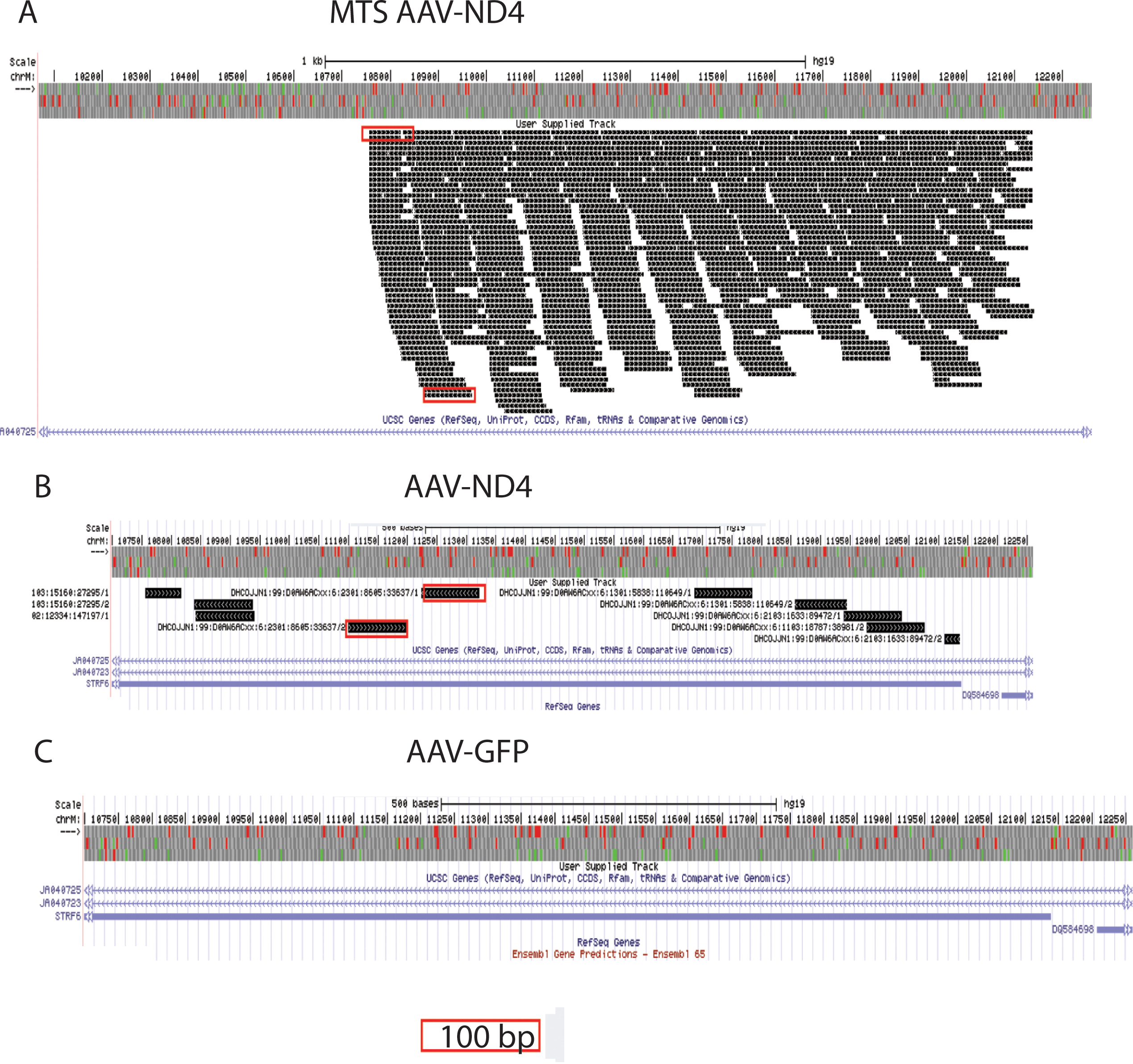 Figure 1. Human ND4 Sequencing. A: Over 500 reads 100 bases long spanned the entire approximately 1.4 kb of human ND4 in retinal samples injected with the MTS AAV containing human ND4 (MTS AAV-ND4). B: Only ten reads of human ND4 were identified in the retinal samples injected with the untargeted AAV containing human ND4 (AAV-ND4). C: No human ND4 reads were detected in samples of mouse eyes injected with AAV-GFP. The red boxes illustrate100 bp read length.