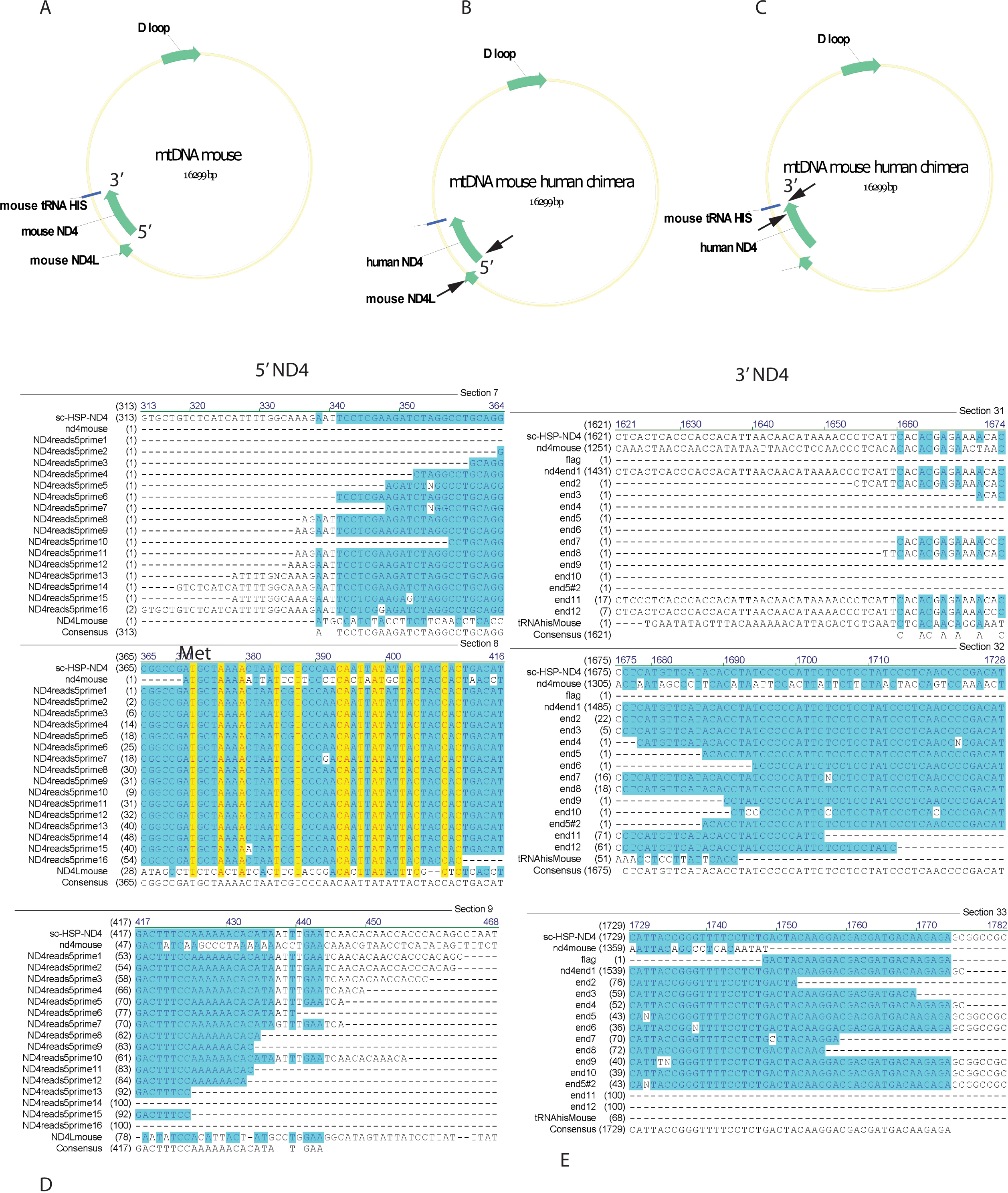 mouse ND4 (arrow). D: Alignment of 5′ human ND4 reads for mouse human chimeras shows only AAV vector sequences upstream of the start methionine codon (ATG) for ND4. If there were homologous recombination of human ND4 into the mouse mitochondrial genome replacing murine ND4, then nucleotides for mouse ND4L would be expected to be adjacent to the ATG methionine codon. E: Alignment of the 3′ human ND4 reads shows the FLAG epitope that we appended to human ND4 for immunodetection and adjacent vector sequences, but not the tRNA histidine that would have indicated homologous recombination.