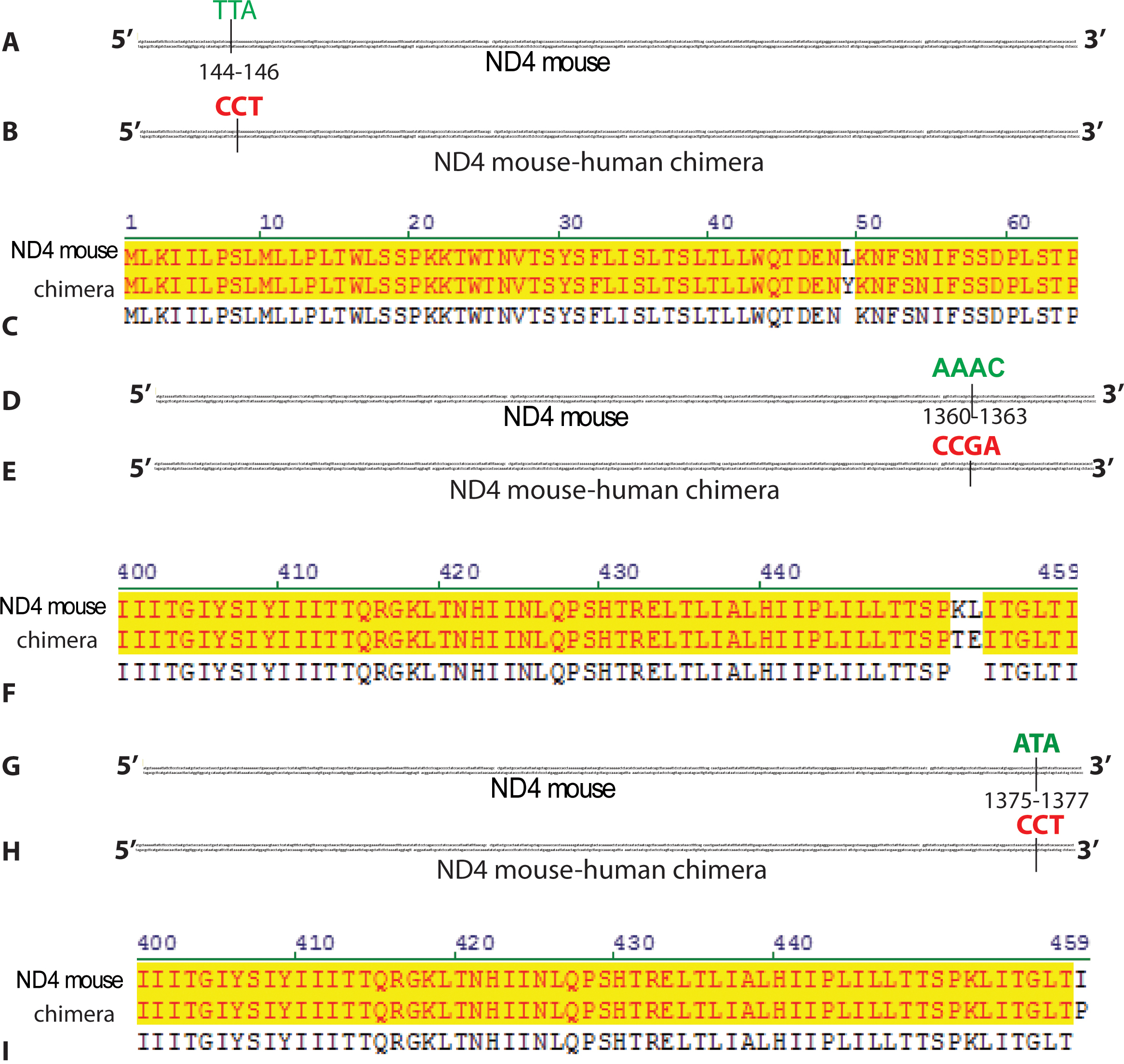 (K) at amino acid 452, as well as a transition of glutamic acid (E) for leucine (L) at amino acid 453. G: An illustration shows the nucleotides ATA at positions 1375–1377 of mouse ND4. (H) An illustration shows the nucleotides ATA of human ND4 at positions 1375–1377 of mouse ND4 next-generation sequencing reads in MTS AAV-ND4-injected eyes. I: Substitution of human CCT for murine ATA would result in a transition of proline (P) for isoleucine (I) at the last amino