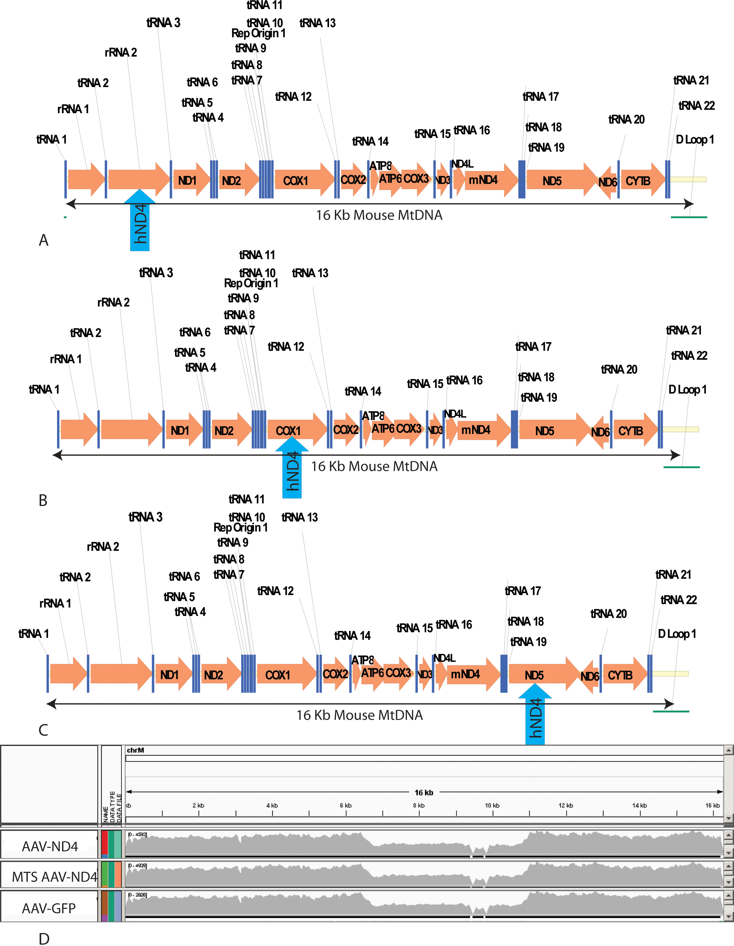Figure 4. Lack of non-homologous recombination. A: An illustration of the 16 kb mouse mitochondrial genome shows potential insertion of human ND4 (blue arrow) between the tRNAs and rRNAs, cytochrome oxidase subunit 1 (B), or ND5 (C). D: Next-generation sequencing reads of the entire mouse mitochondrial genome of AAV-ND4-, MTS-AAV-ND4-, or AAV-GFP-injected eyes were identical and showed no insertions of human ND4 bases into non-homologous sites of the host genome.