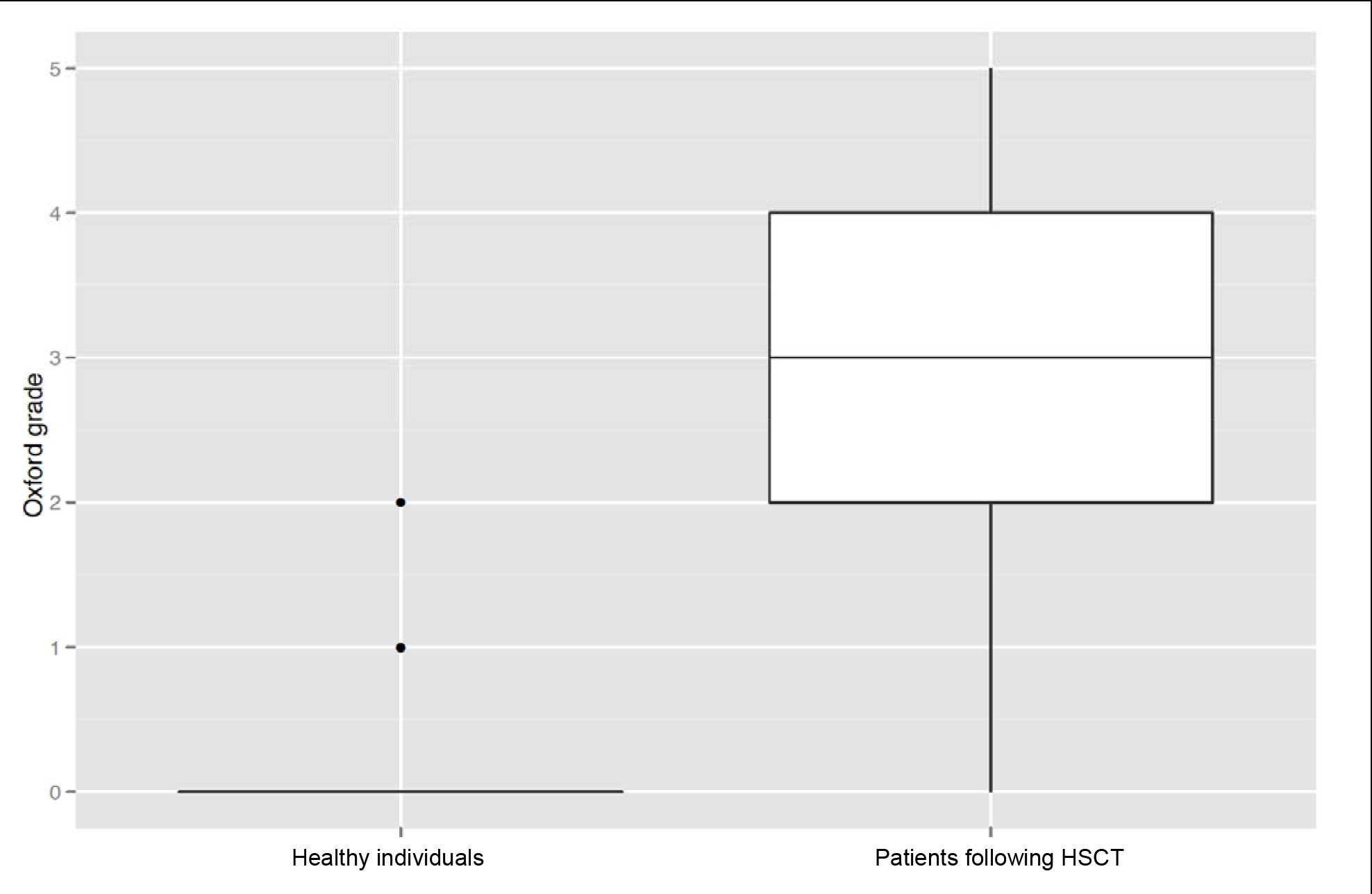 Figure 2. Oxford grades were compared between the control (n=19) and the patient group (n=27). Box plots display the median and quartiles