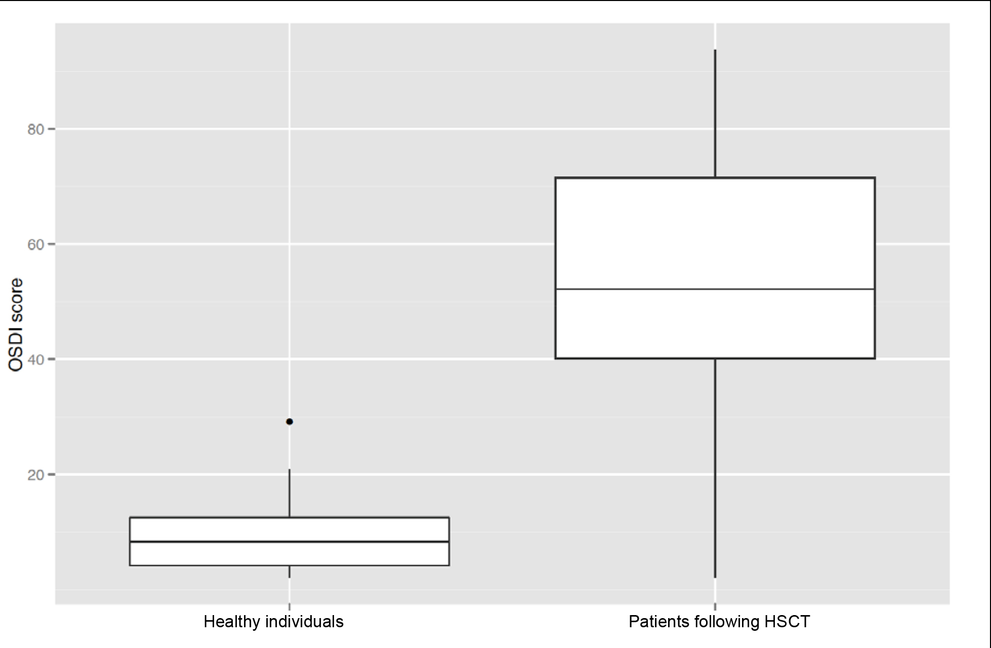Figure 3. Box plots. Box plots display the median and quartiles (Q0,25 and Q0,75) and the total range of the ocular surface disease index score, which was 8.3 in the control group (n=19) and 52.2 in the