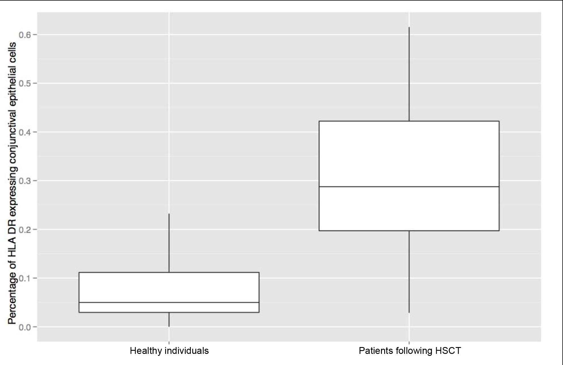 Figure 4. Box plots display the median and quartiles (Q0,25 and Q0,75) and the total range of human leucocyte antigen (HLA)-DR expression. A median of 5.0% of conjunctival epithelial cells expressed