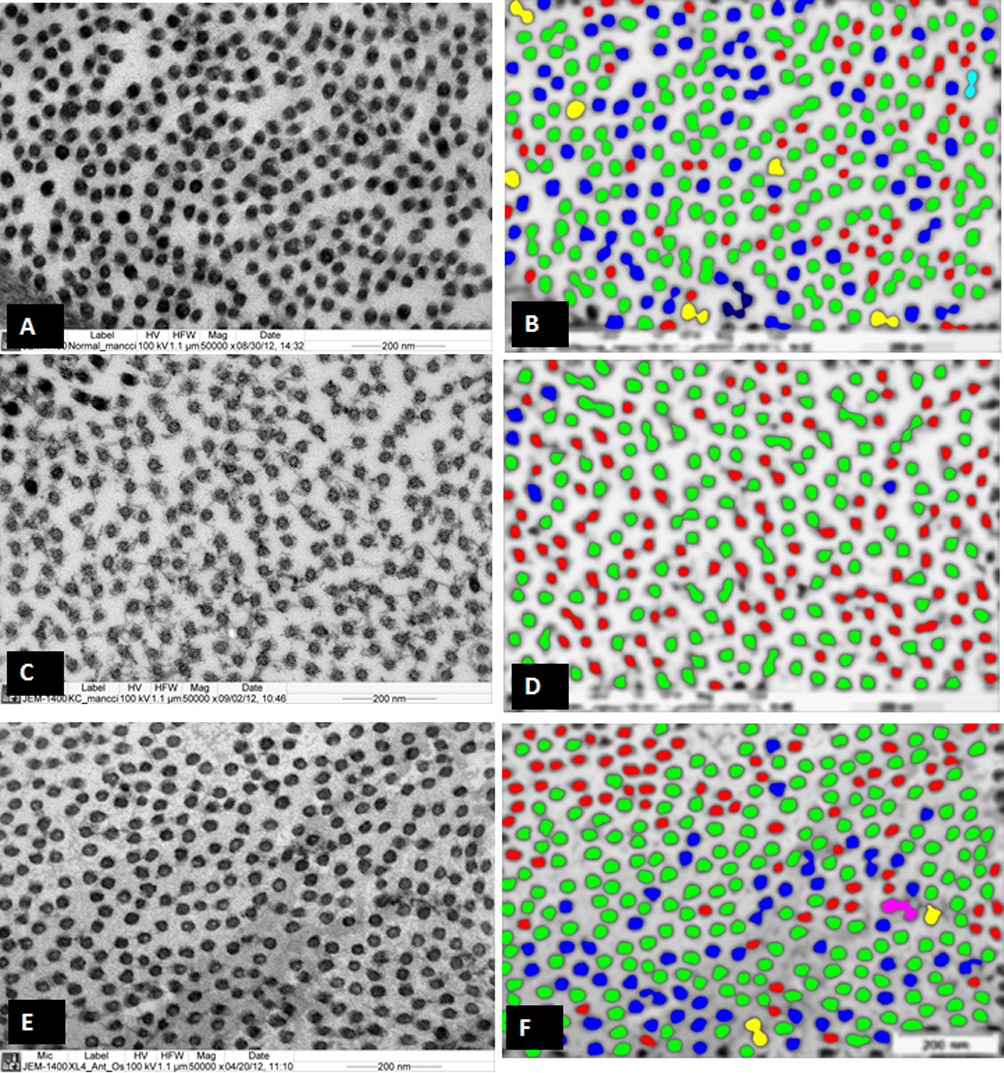 A: Electron micrograph of collagen fibrils which are present in the normal human corneas. B: Digital image obtained after processing the image shown in A. C: Electron micrograph of the collagen fibrils which are present in the KC corneas. D: Digital image is obtained after processing the image shown in C. E: Electron micrograph of collagen fibrils which are present in the CXL corneas. F: Digital image obtained after processing the image shown in E. The images were displayed by using color coding to demonstrate the distribution of the variable diameters of collagen fibrils.
