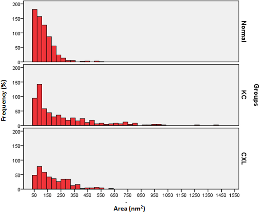 ) in normal, keratoconus, and cross-linked corneas. The data were derived from three corneas and six images of each group.