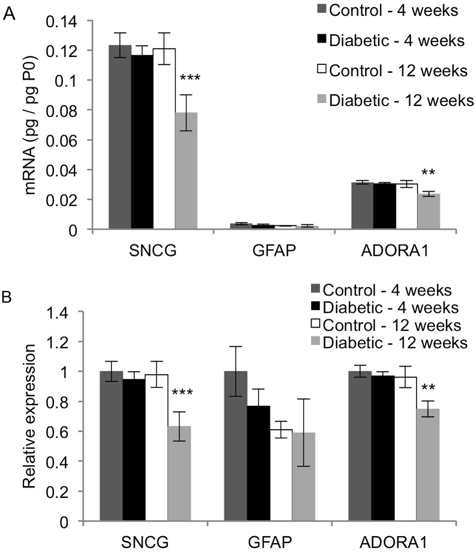 (P0) for each rat (A), and then scaled to the 4-week control rats for each gene (B; mean ± SEM). The 12-week diabetic rats had significantly lower SNCG and ADORA1 mRNA levels than the age-matched control