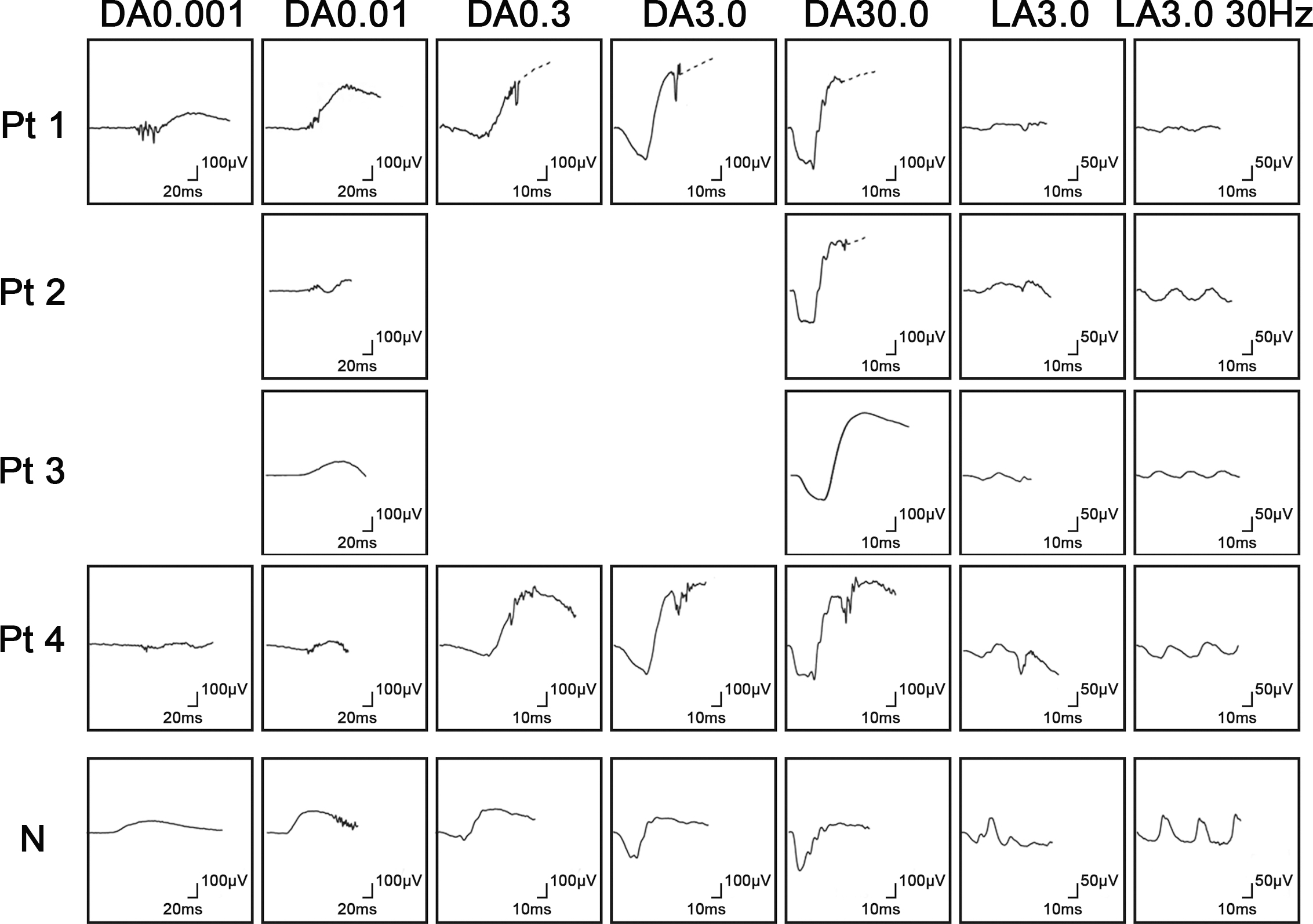 Vision (ISCEV): (i) dark adapted dim flash 0.01 cd•s•m−2 (DA 0.01), (ii) dark adapted bright flash 30.0 cd•s•m−2 (DA 30.0), (iii) light adapted 3.0 cd•s•m−2 at 2 Hz (LA 3.0), and (iv) light adapted 3.0 cd•s•m−2 30 Hz flicker ERG (LA 3.0 30Hz). The extended protocol was applied to two subjects (patients 1 and 4), including the recording
