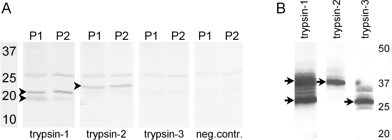 Trypsin-1 was present as a double band and trypsin-2 as a single band (arrowheads). No specific staining was seen after the