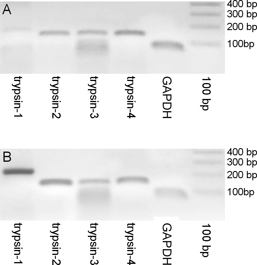 polymerase chain reaction (RT–PCR). No trypsinogen-1 coding mRNA was found in any retina. B: Testing of the primers on pancreas complementary deoxynucleic acid (cDNA), which served as positive control, showed that