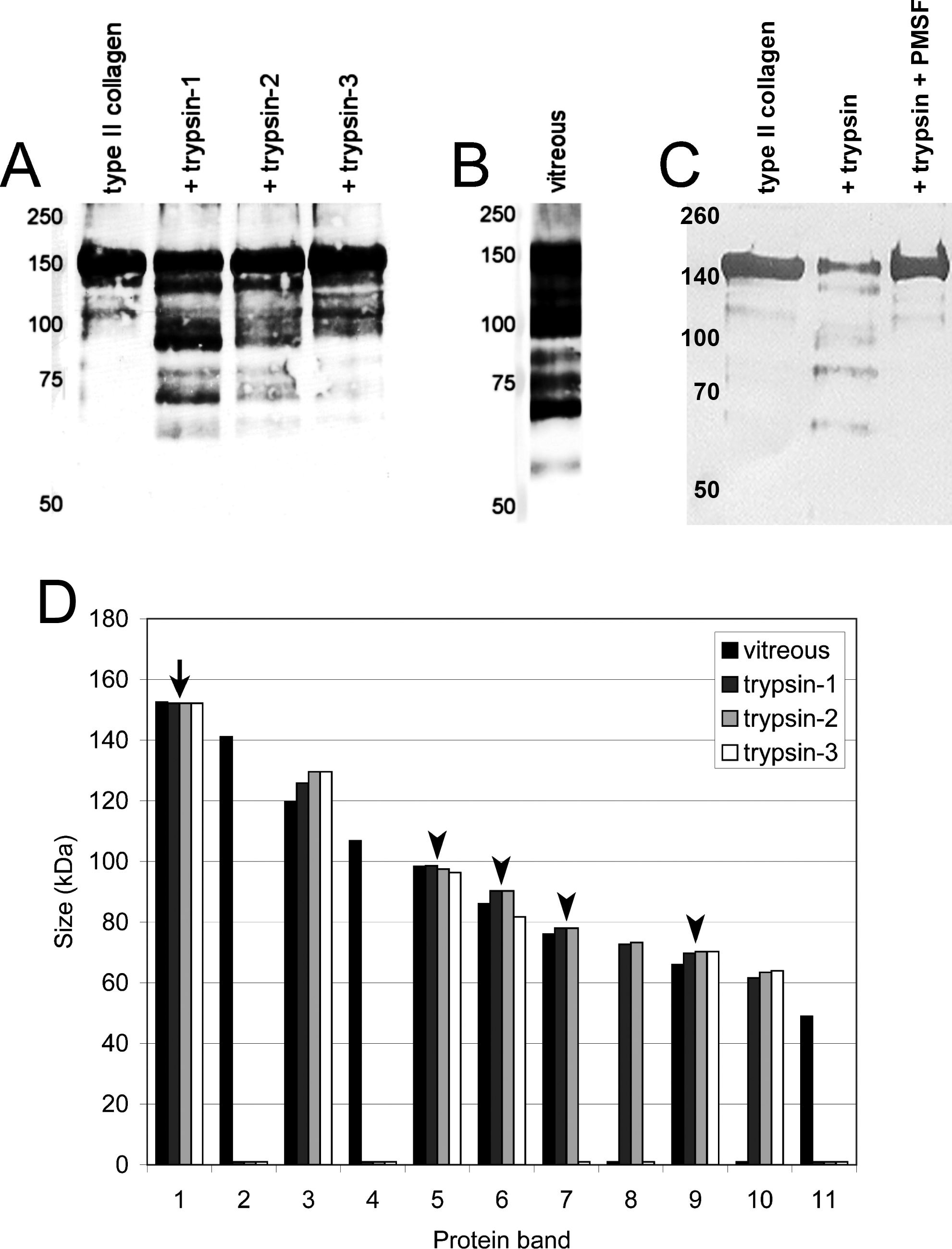 A shows uncleaved type II collagen from cartilage (left lane) and the degradation patterns after incubation with trypsin-1,