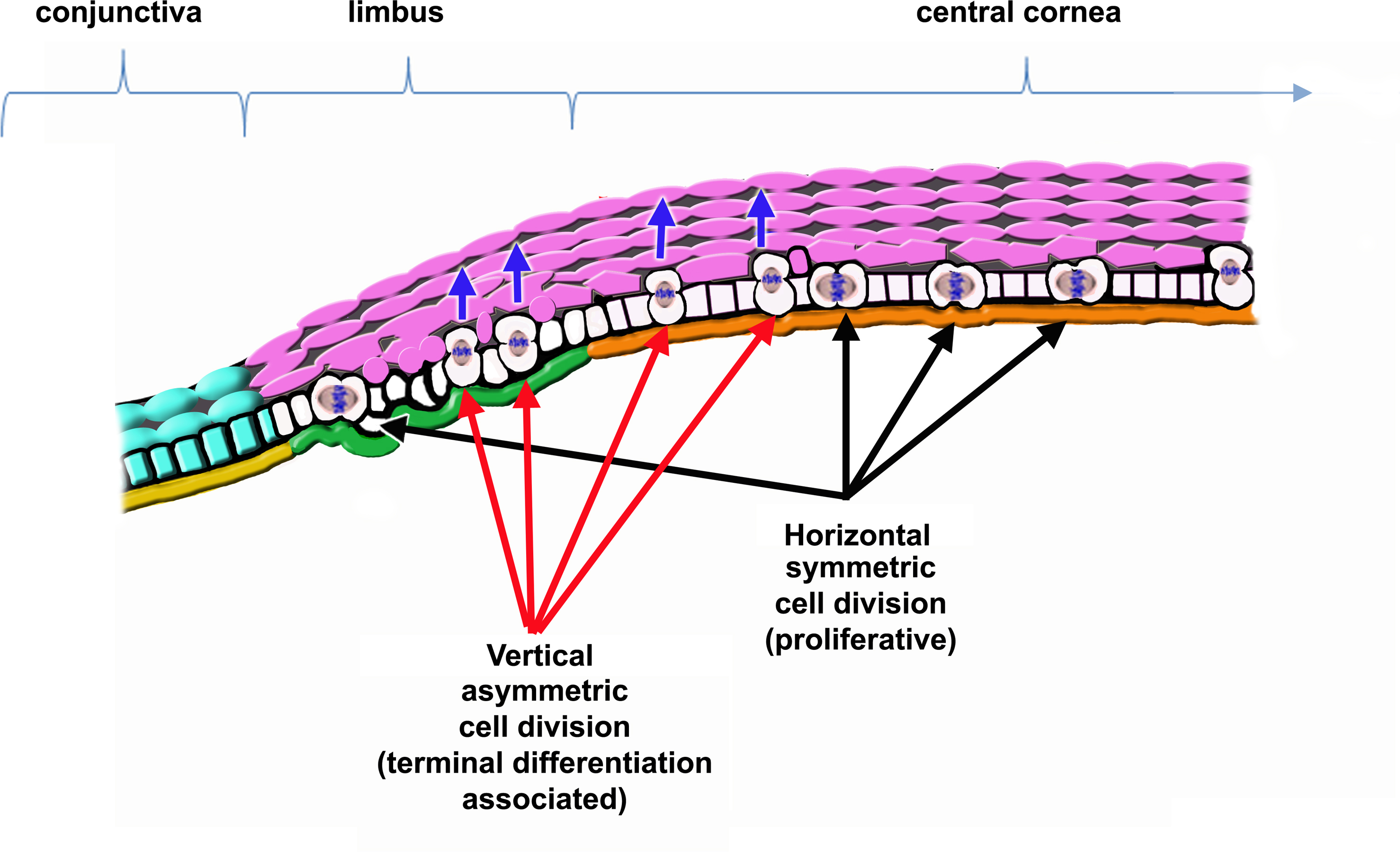 Figure 1. Representation of corneal epithelial cell renewal dependent on proliferative symmetric mitosis of stem cells and their progeny.