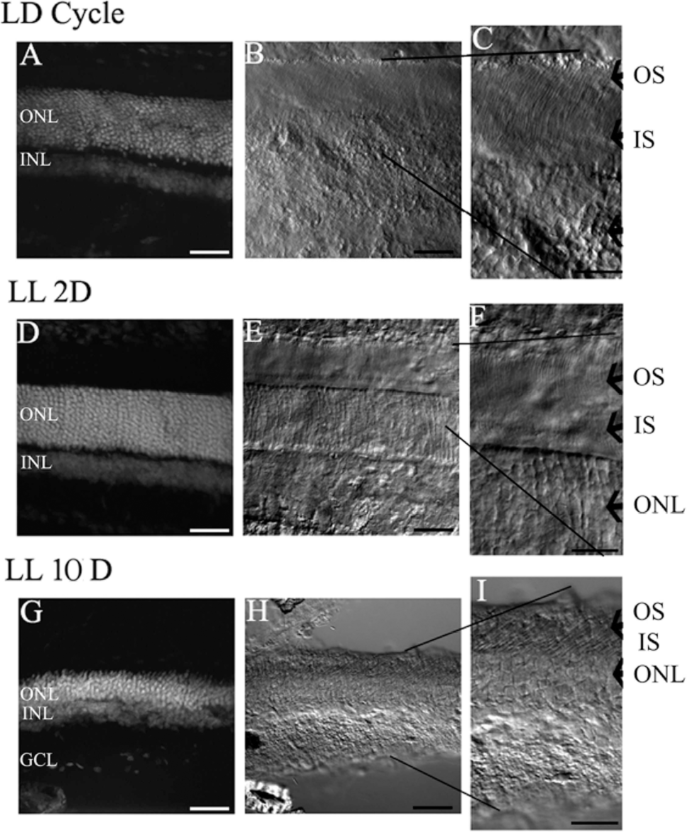 To access the data, click or select the words “Appendix 1.” A-C: Retinas reared in a 12:12 h light (200 lx): dark cycle (LD Cycle). D-F: Retinas exposed to constant low light for two days (LL 2D). G-I: Retinas exposed to constant low light for ten days (LL 10D), A,D,G: Retinas labeled with PI; B,E,H: Transmittance image. Scale bar indicates 30 µm C,F,I: Transmittance image. Scale bar indicates 15 µm. ONL, outer nuclear layer; INL, inner nuclear layer; GCL, ganglion cell layer; OS, outer segment; IS, inner segment.