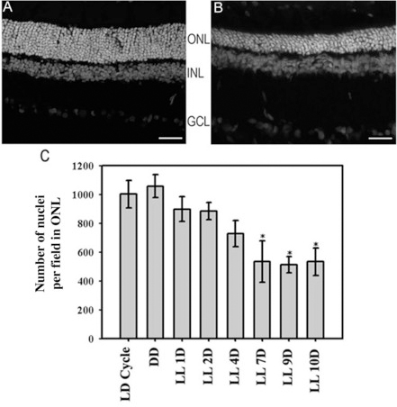 to 200 lx light (LL) for 1,2,4,7, 9 and 10 days were analyzed to quantify photoreceptor survival. The number of nuclei in
