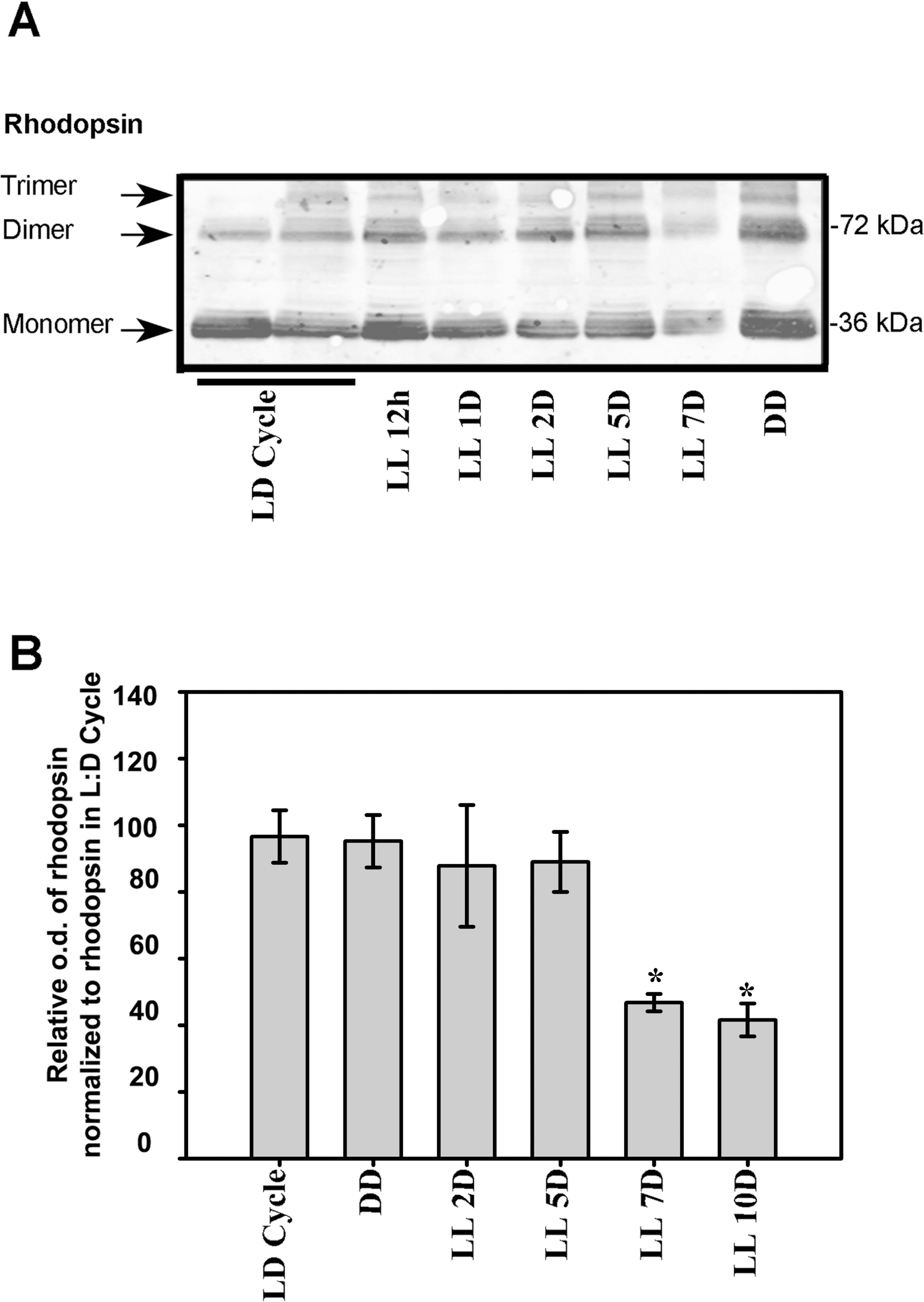 Figure 4. Analysis of rhodopsin expression in rat retina exposed to low-intensity light. A: A western blot immunolabeled rhodopsin with a specific antibody showing the predicted isoform bands. The margin shows the