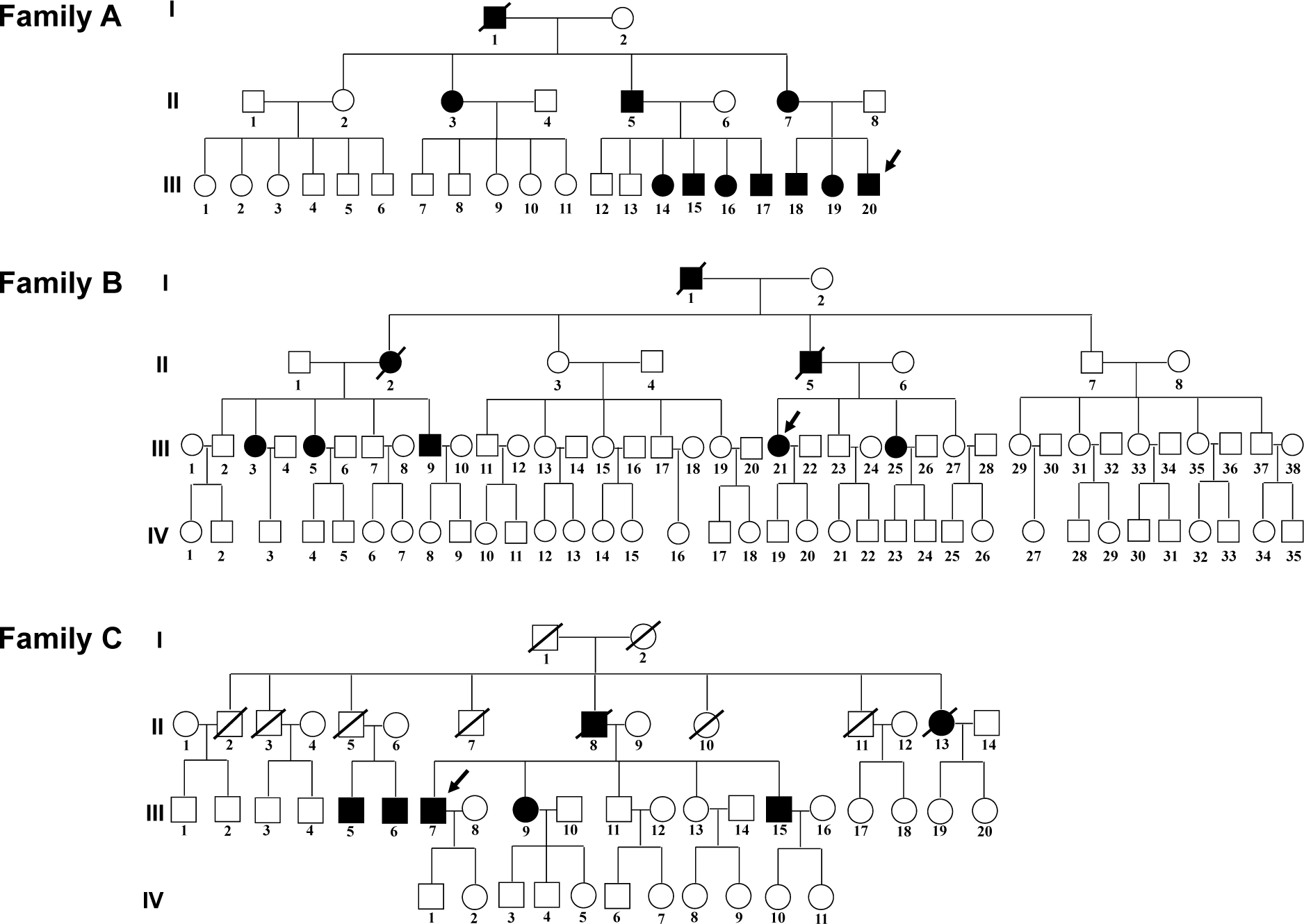 amyloidosis. Penetrance of disease varied in Family A, Family B, and Family C. The probands are marked with arrows. The samples