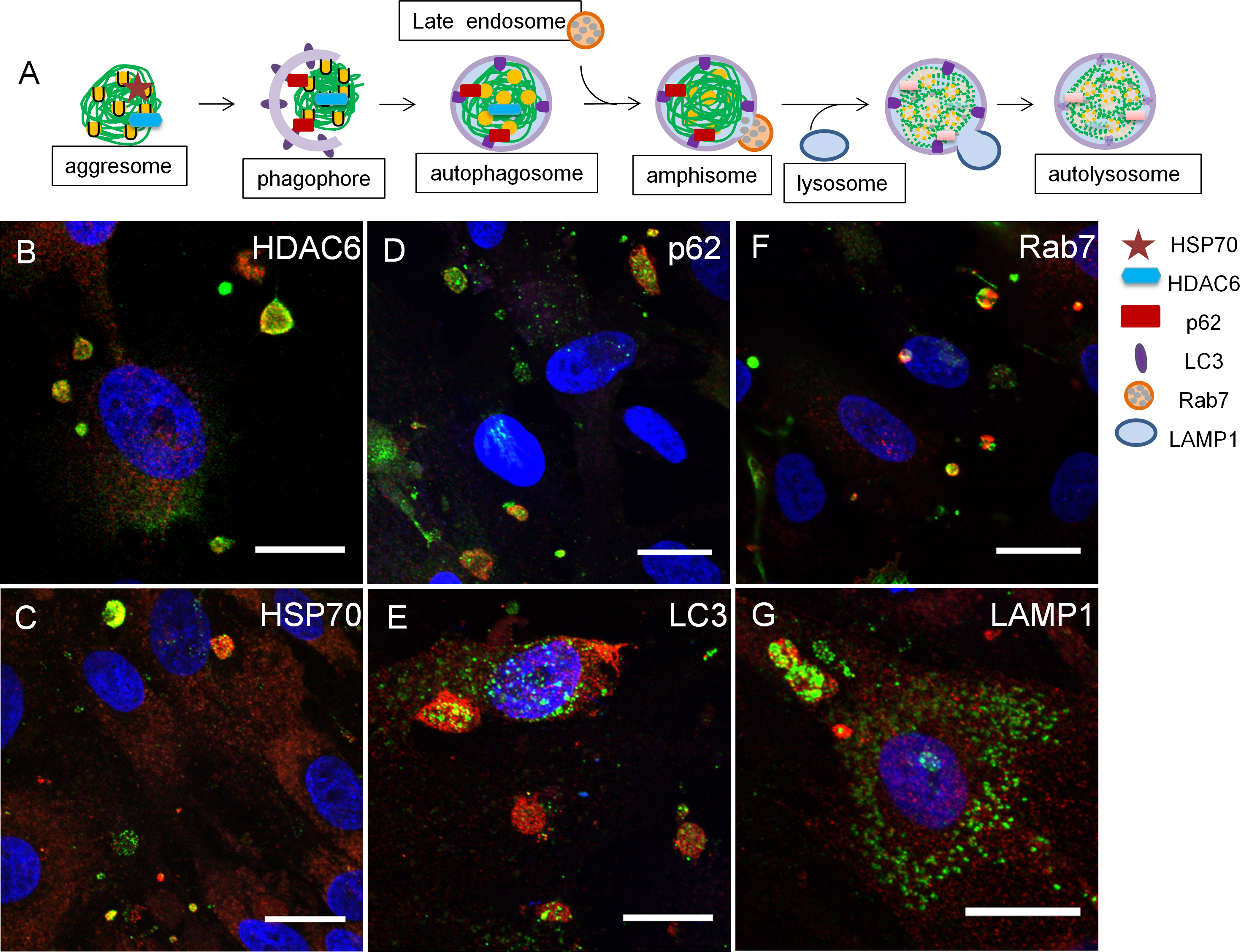 biomarkers in human trabecular meshwork cells. A: A schematic shows the sequential steps and biomarkers of the autophagy-lysosomal (AL) pathway. B–G: HTM cells were immunostained with the rabbit ankyrin repeat and suppressor of cytokine signaling (SOCS) box containing protein-10