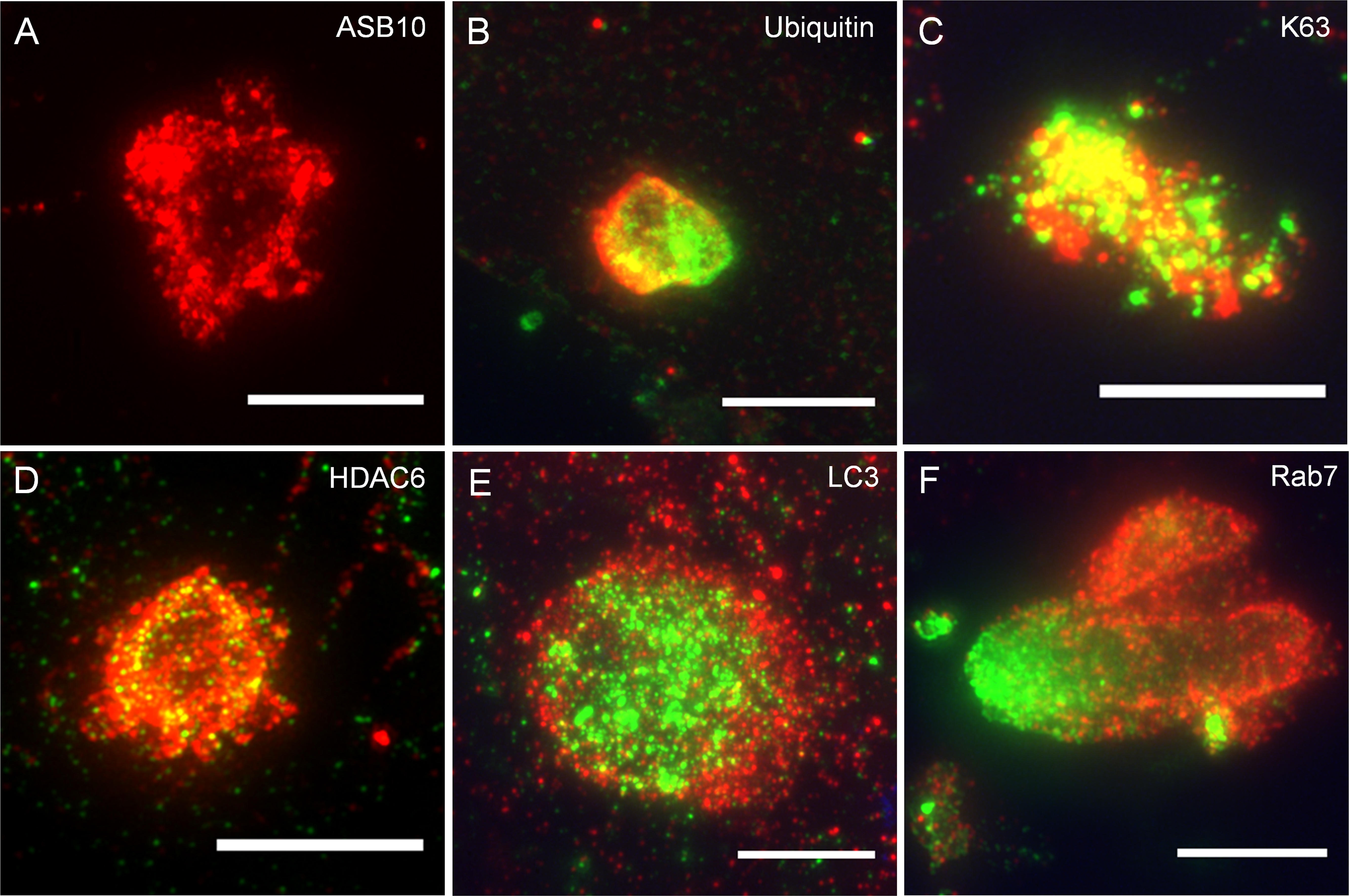 box containing protein-10 (ASB10) antibody (red; A, B, D–F), the goat polyclonal ASB10 antibody (red; C), total ubiquitin (green; B), K63-linked ubiquitin (green; C), histone deacetylase 6 (HDAC6, green; D), light chain 3 (LC3, green; E), and Rab7 (green; F). Scale bars=5 µm.